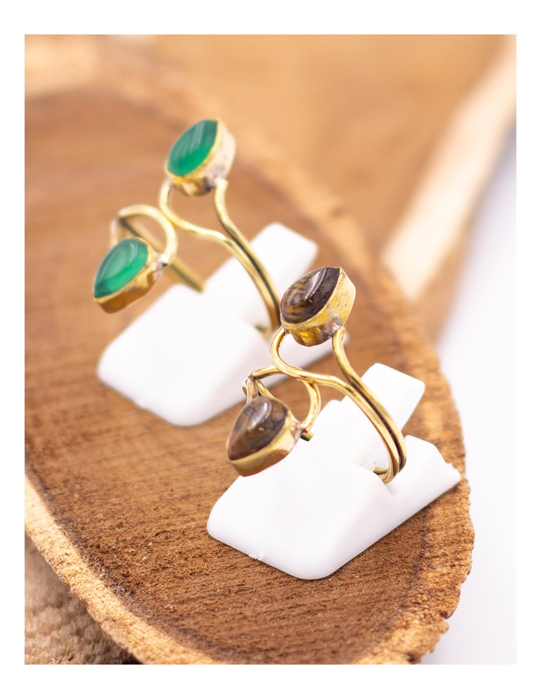 Kimago ring in gold or silver finish with two mineral stones and handcrafted adjustable design.
