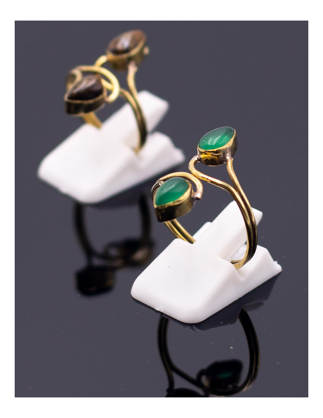 Available in gold or silver finish, it stands out for its open structure and for the two mineral stones of the same color that give character and personality to the piece.