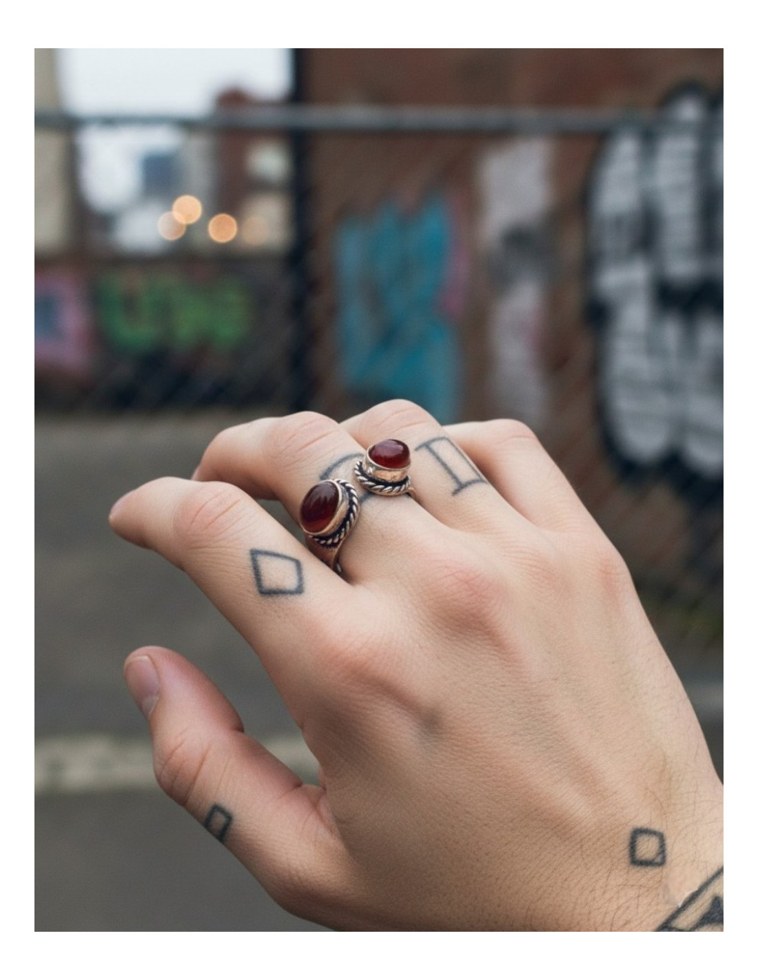 The metal surface is meticulously carved with decorative details , lending texture and a handcrafted character to the piece. In each ring, the two stones share the same color, although the colors vary from one ring to another , as they are randomly selected, making each piece unique.