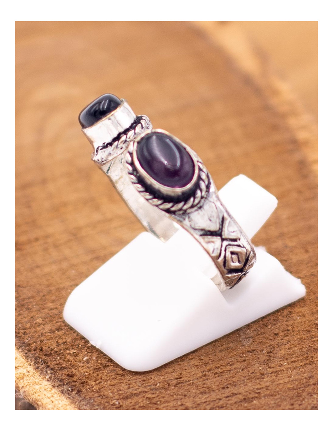 The Kimago open ring with double stone is an ethnically inspired piece of jewelry that reflects the charm of traditional Indian craftsmanship .