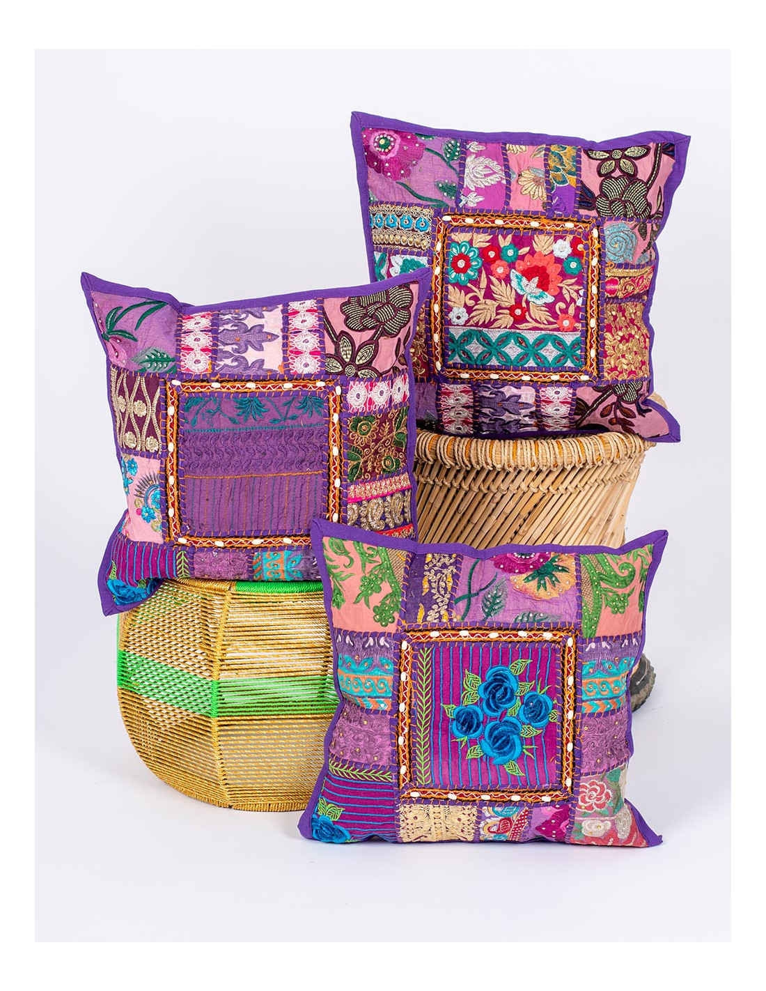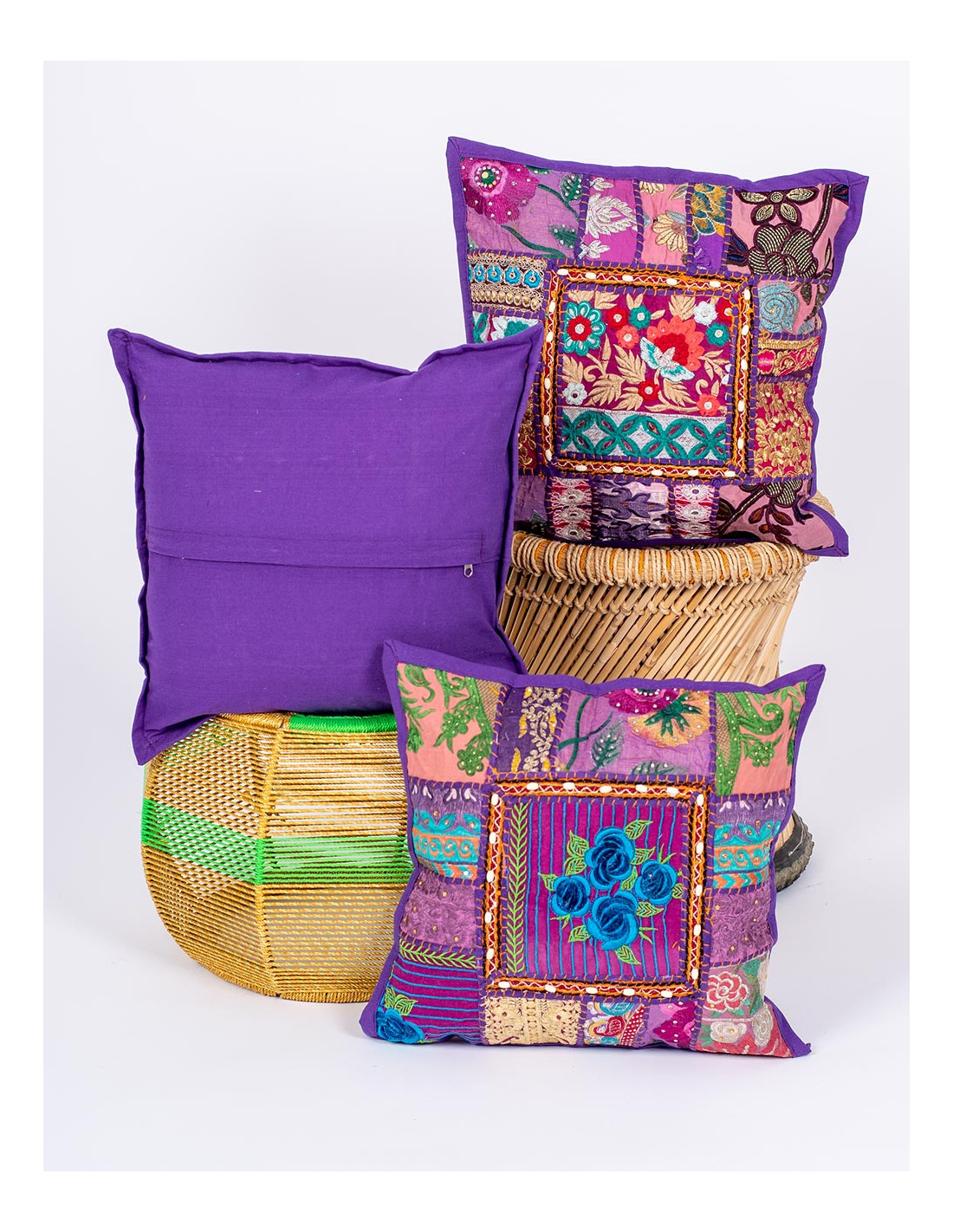 Purple cotton cushion cover, handmade in India. Boho style with unique embroidery and handcrafted details.