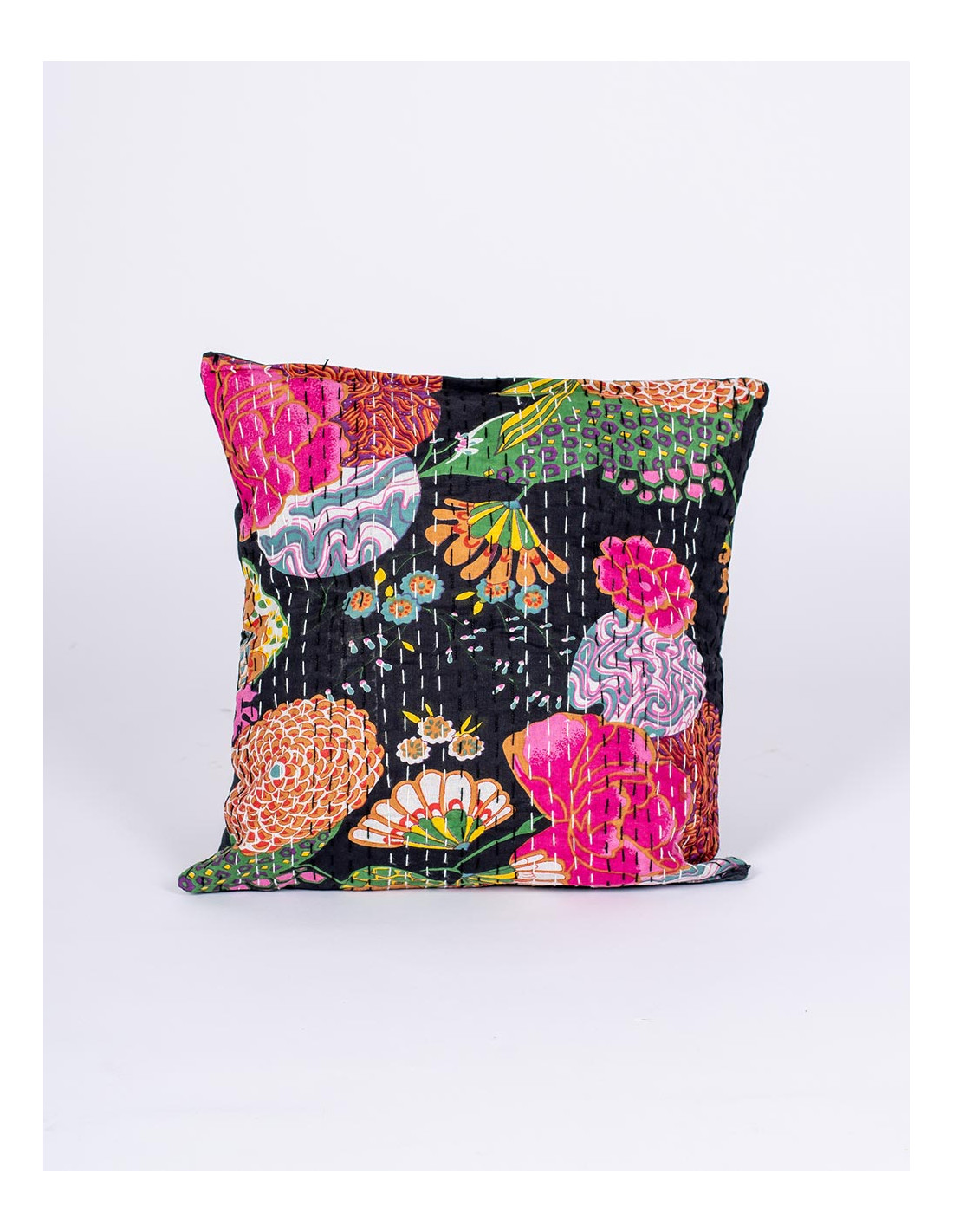 Kimago cushion cover in black cotton with floral motifs and decorative ethnic-style stitching.