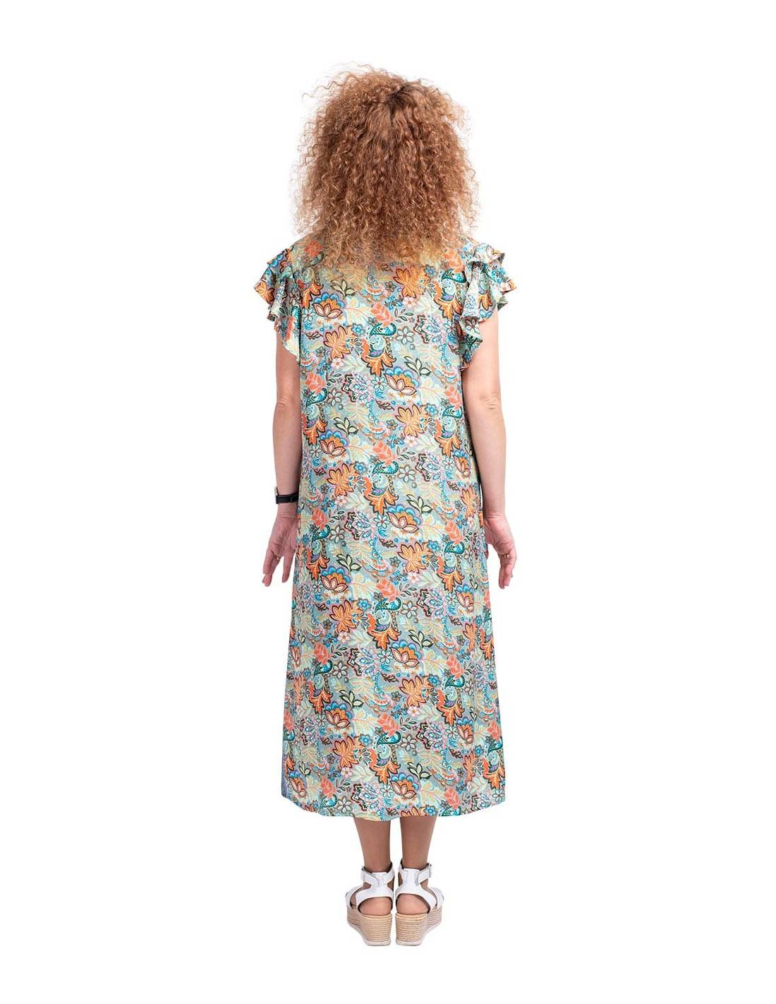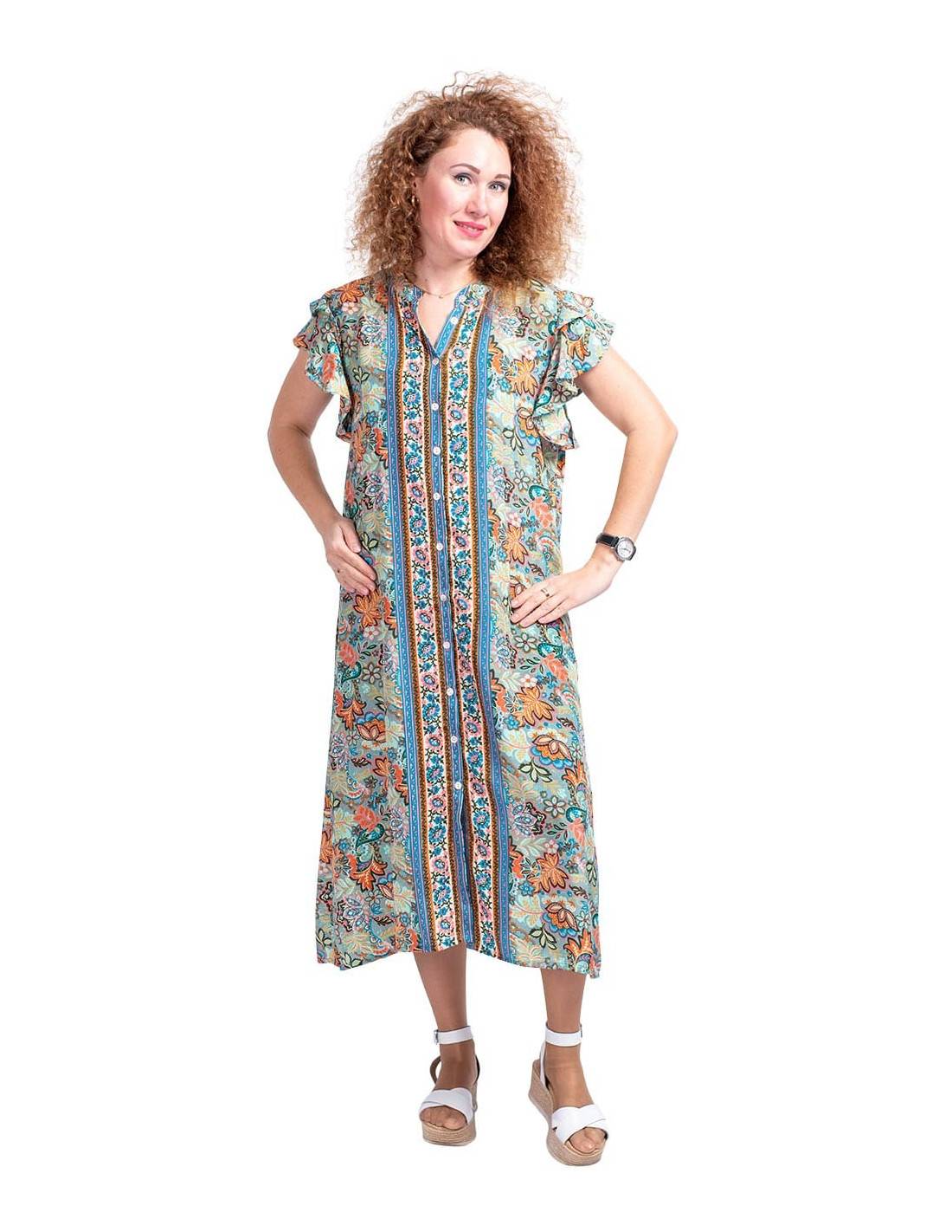 Short boho style silk dress with 3/4 sleeves. The background is salmon and the drawings are in blue and turquoise tones.