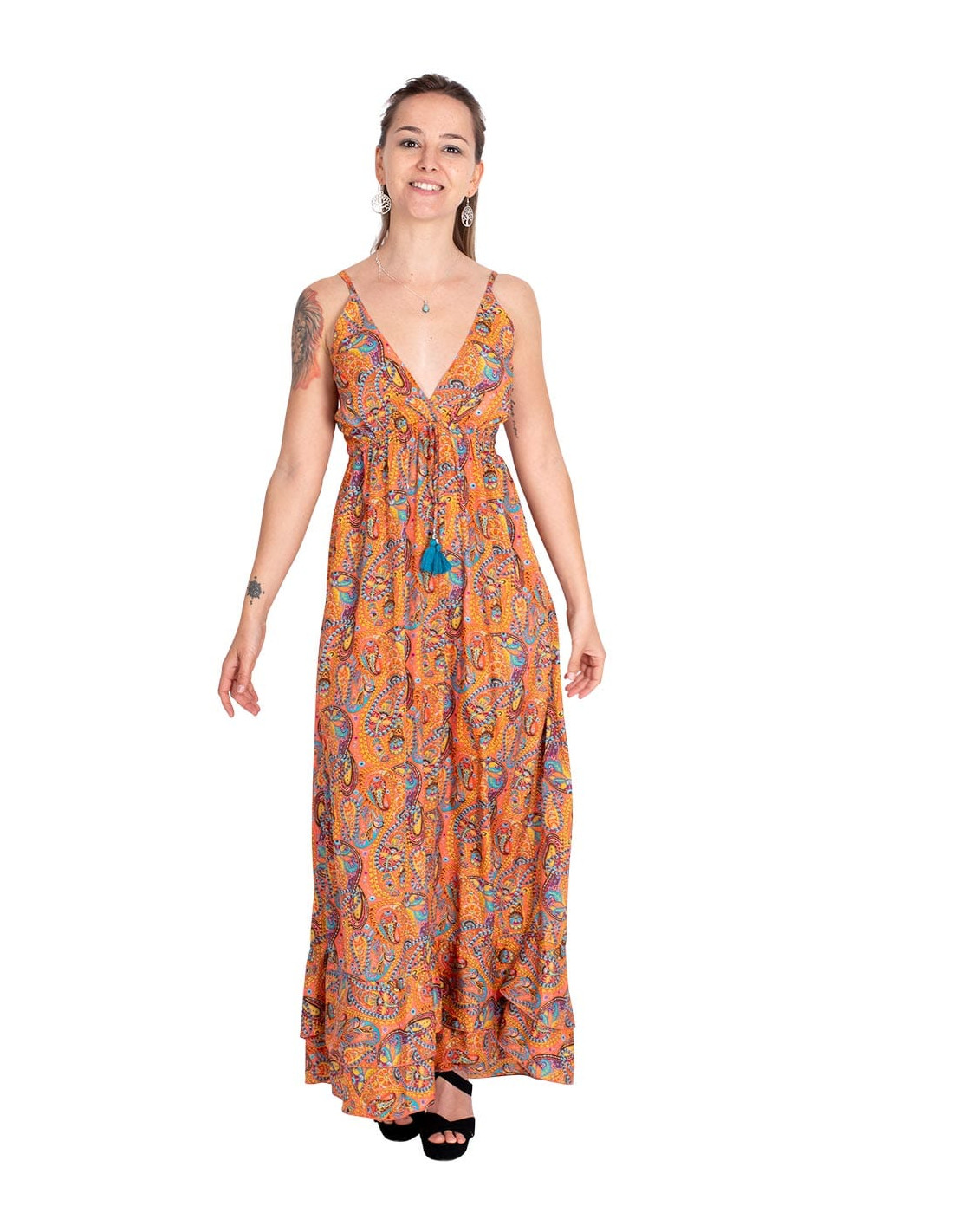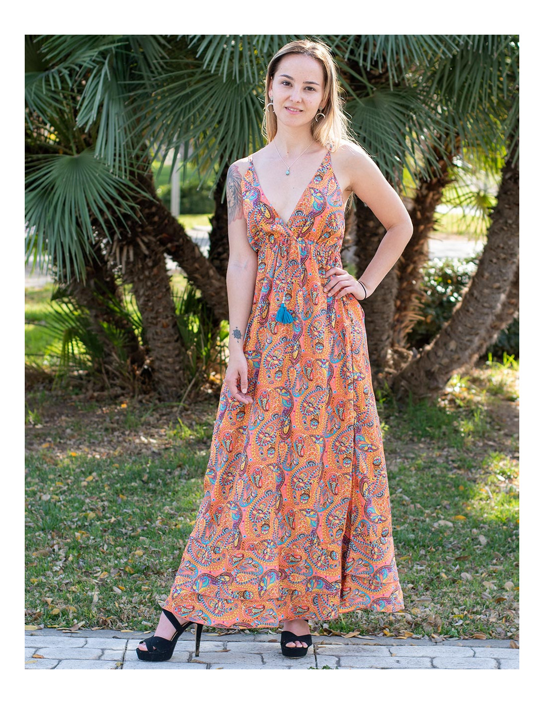 High-waisted skinny pants with an orange background patterned with blue and purple drawings