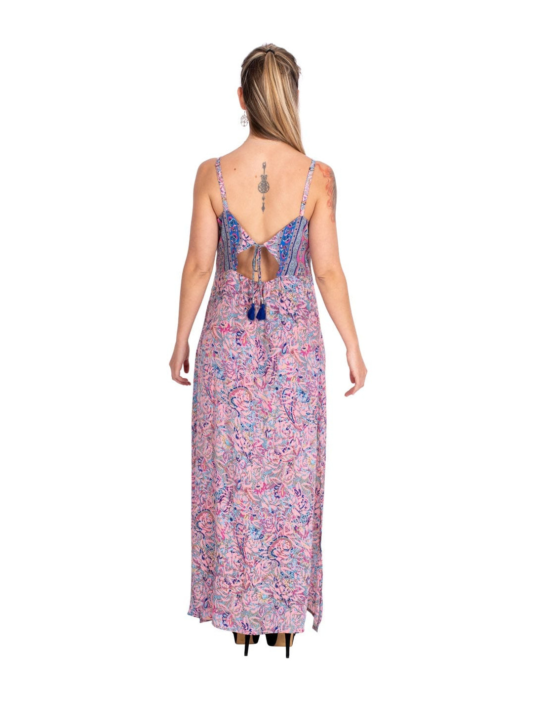 Long one size wide dress with short sleeves. Its pattern is green with details in salmon and purple. NOT INCLUDED THE BELT It belongs to the collection with the project: