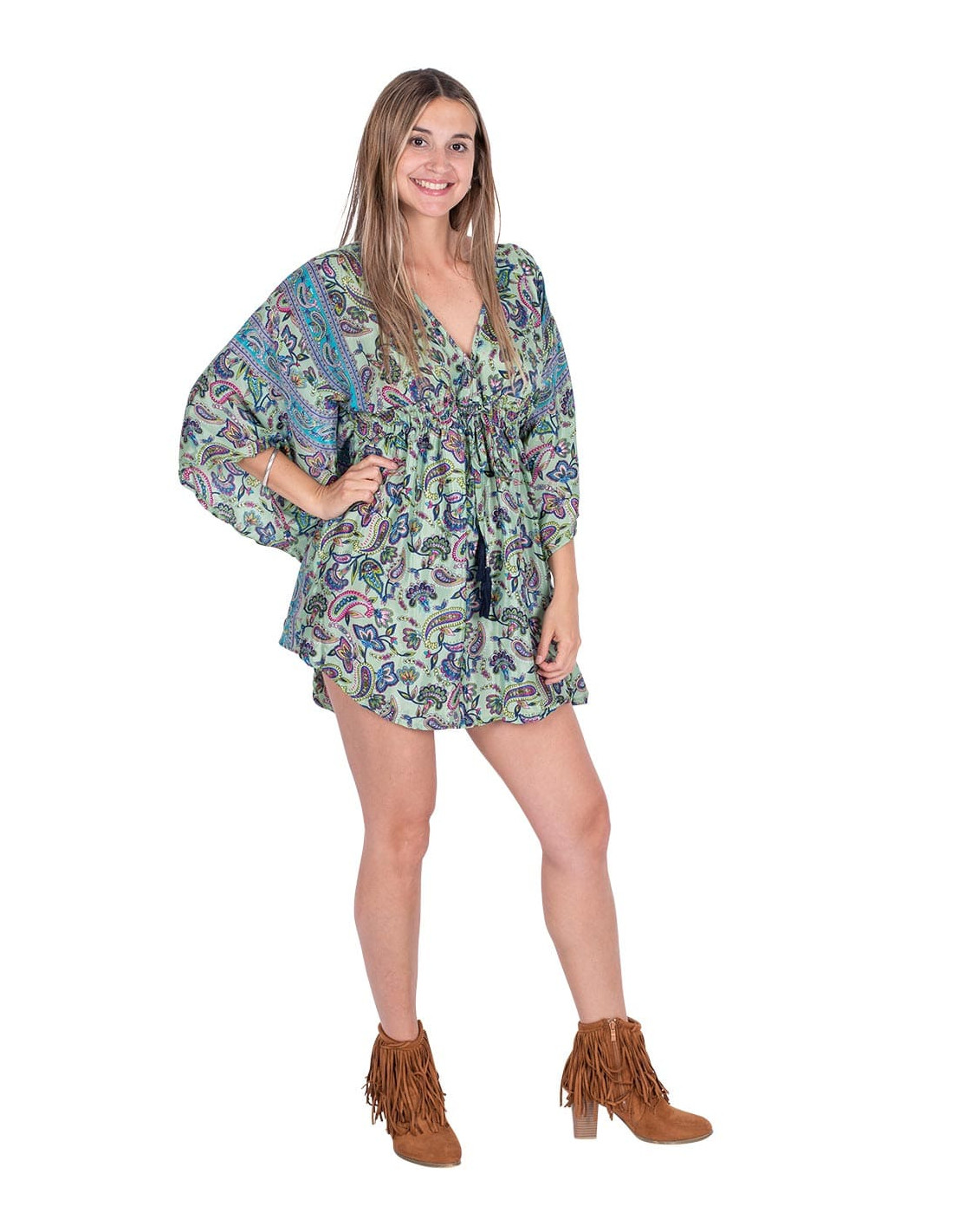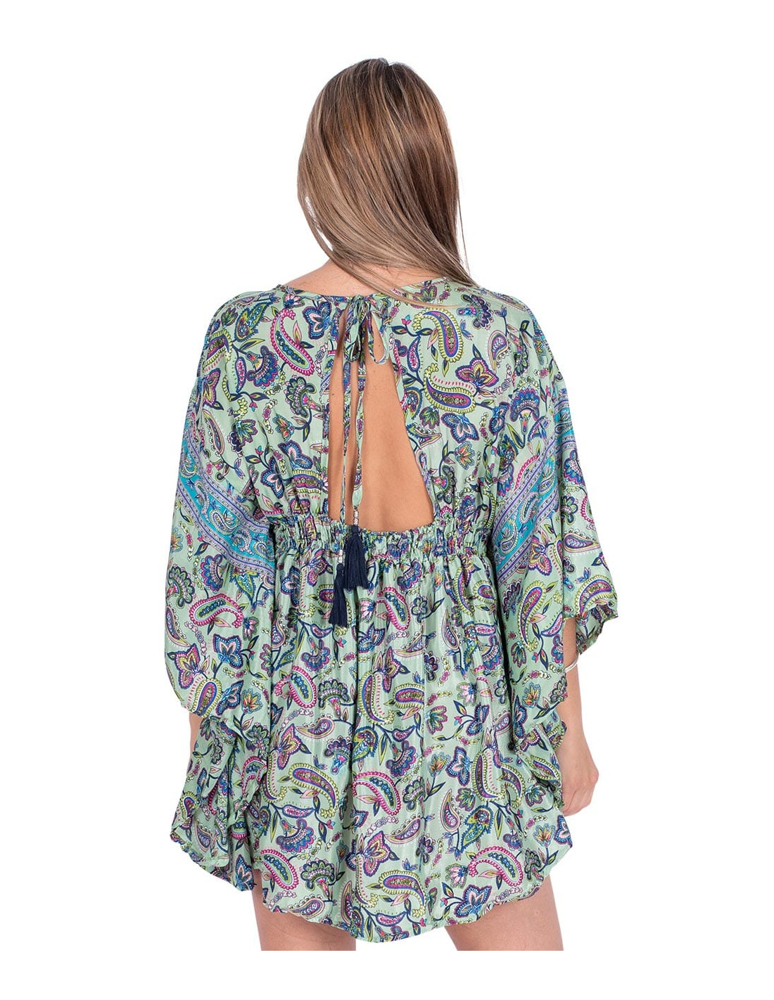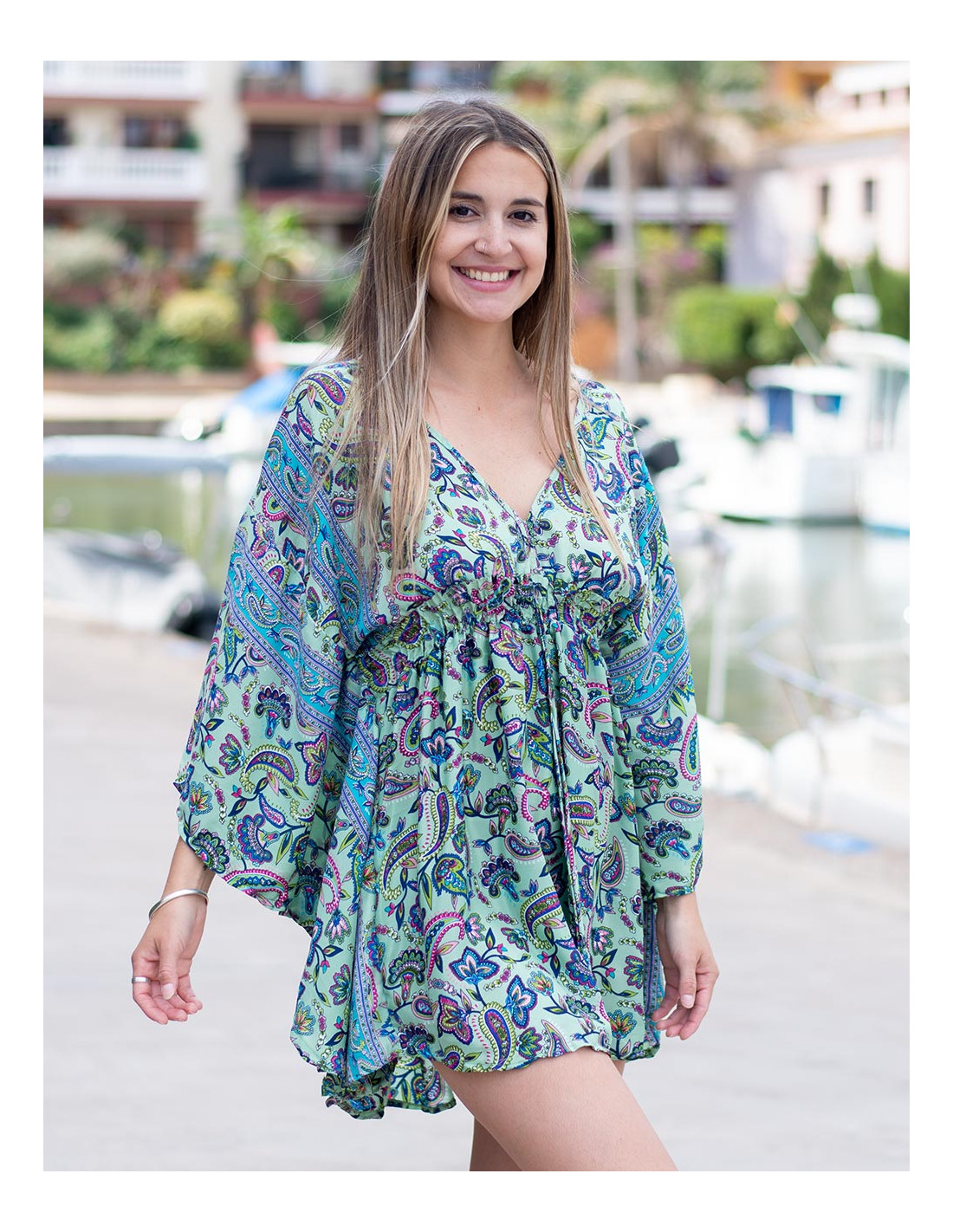 Short dress with ruffles and boho style sleeves. Its print has a brown background but a large number of light blue flowers that stand out It belongs to the collection with the project: