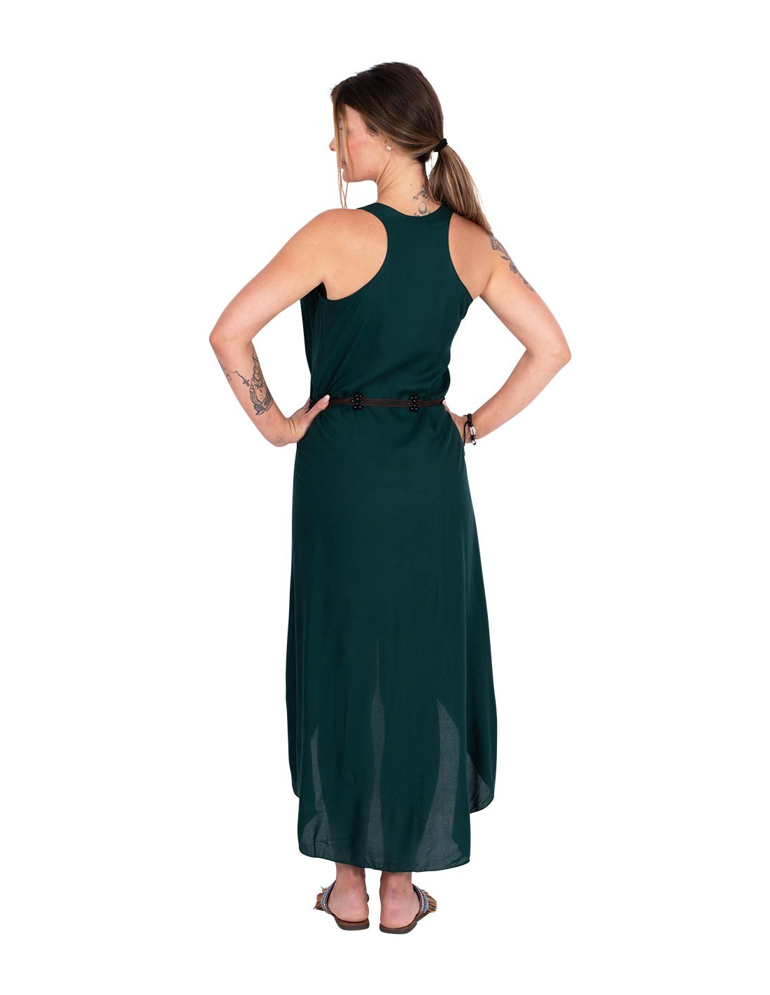 Short dress with wide straps. Its print has a brown background but a large number of light blue flowers that stand out It belongs to the collection with the project: