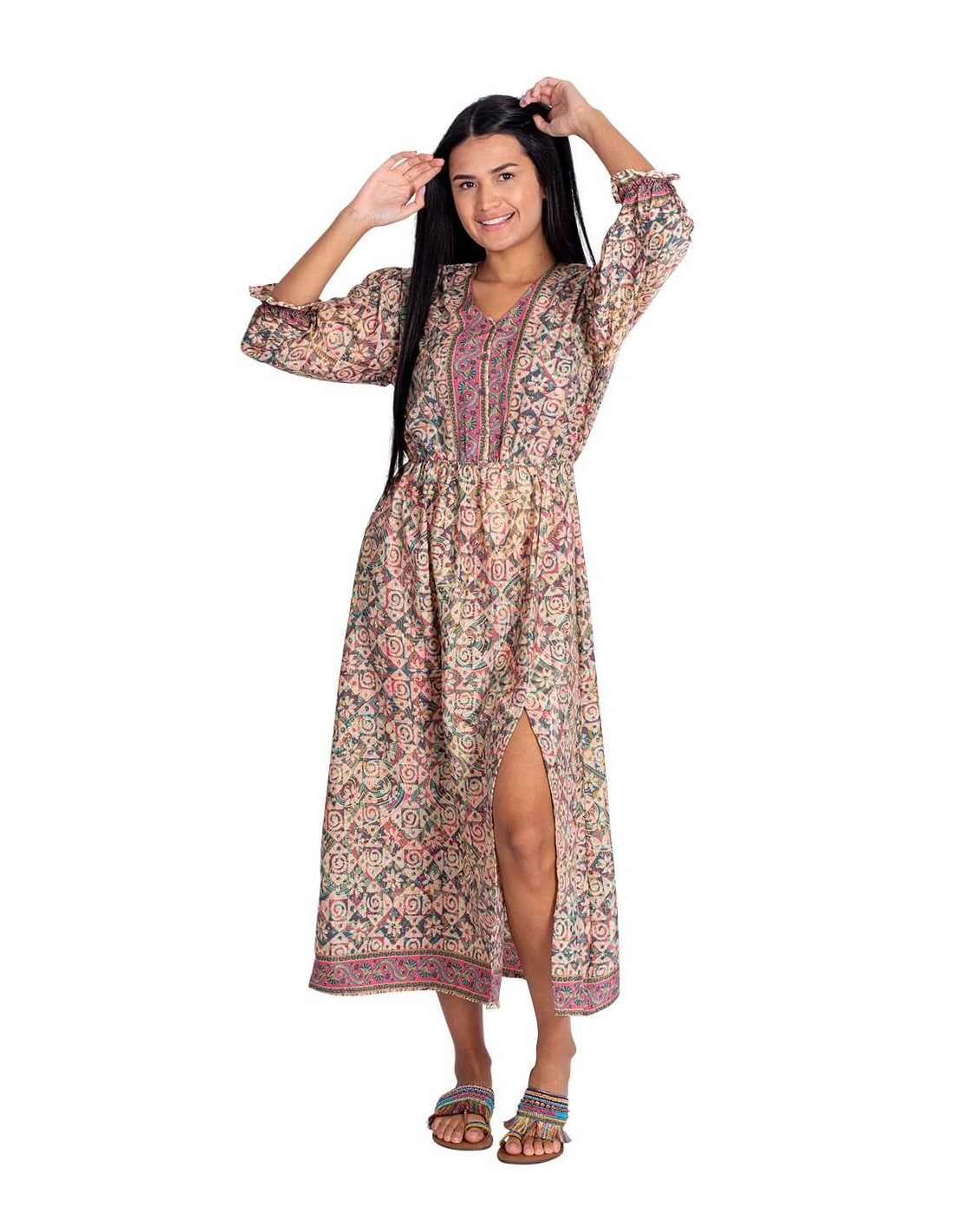 Pink background midi dress with gray flowers It belongs to the collection with the project: