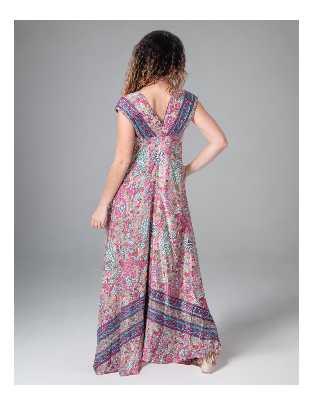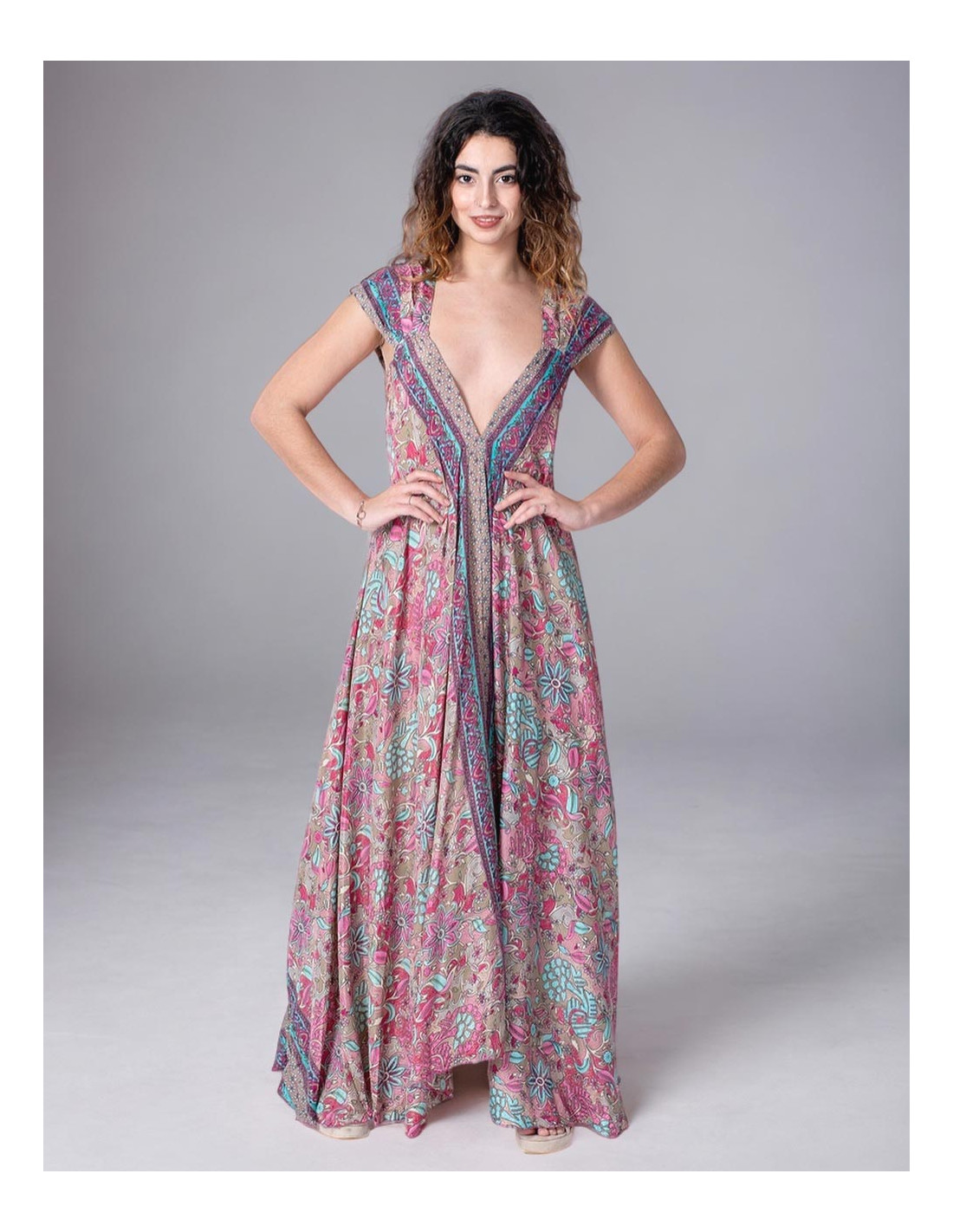 Short green printed silk dress with some pink details It belongs to the collection with the project: