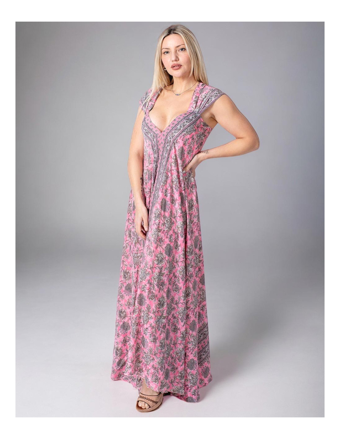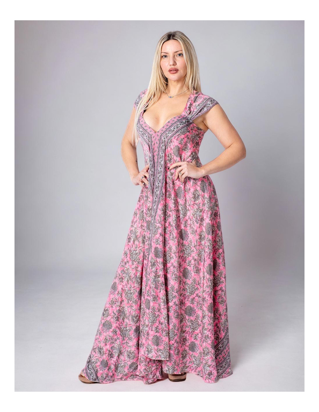 Long one size wide dress with short sleeves. Its pattern is green with details in salmon and purple. NOT INCLUDED THE BELT It belongs to the collection with the project: