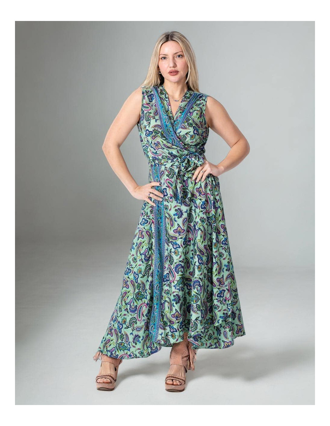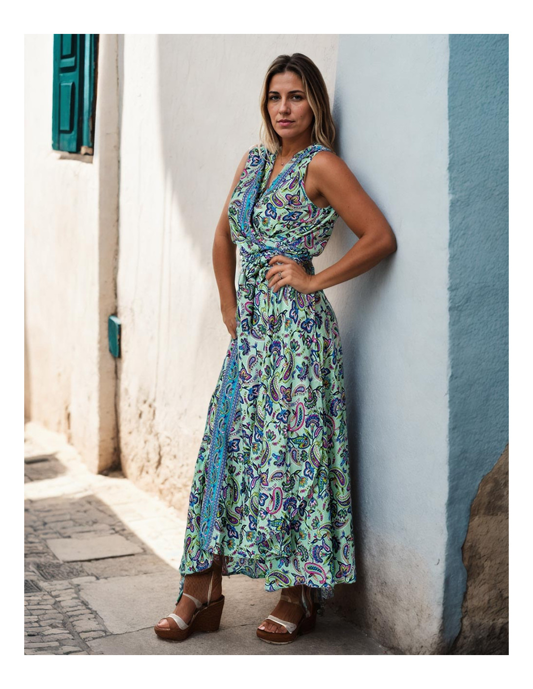 Long buttoned skirt printed with a light blue background and drawings in red tones