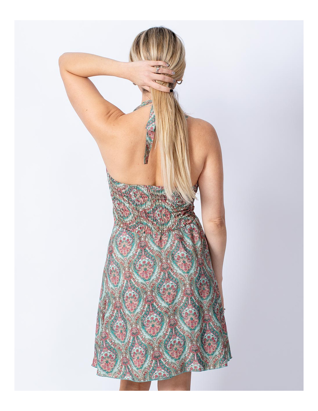 Short blouse with 3/4 sleeves, made of printed silk with a green background and yellow drawings