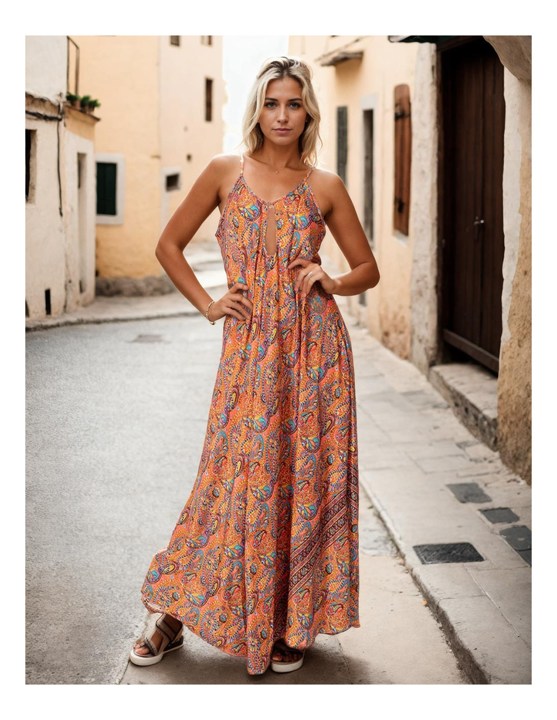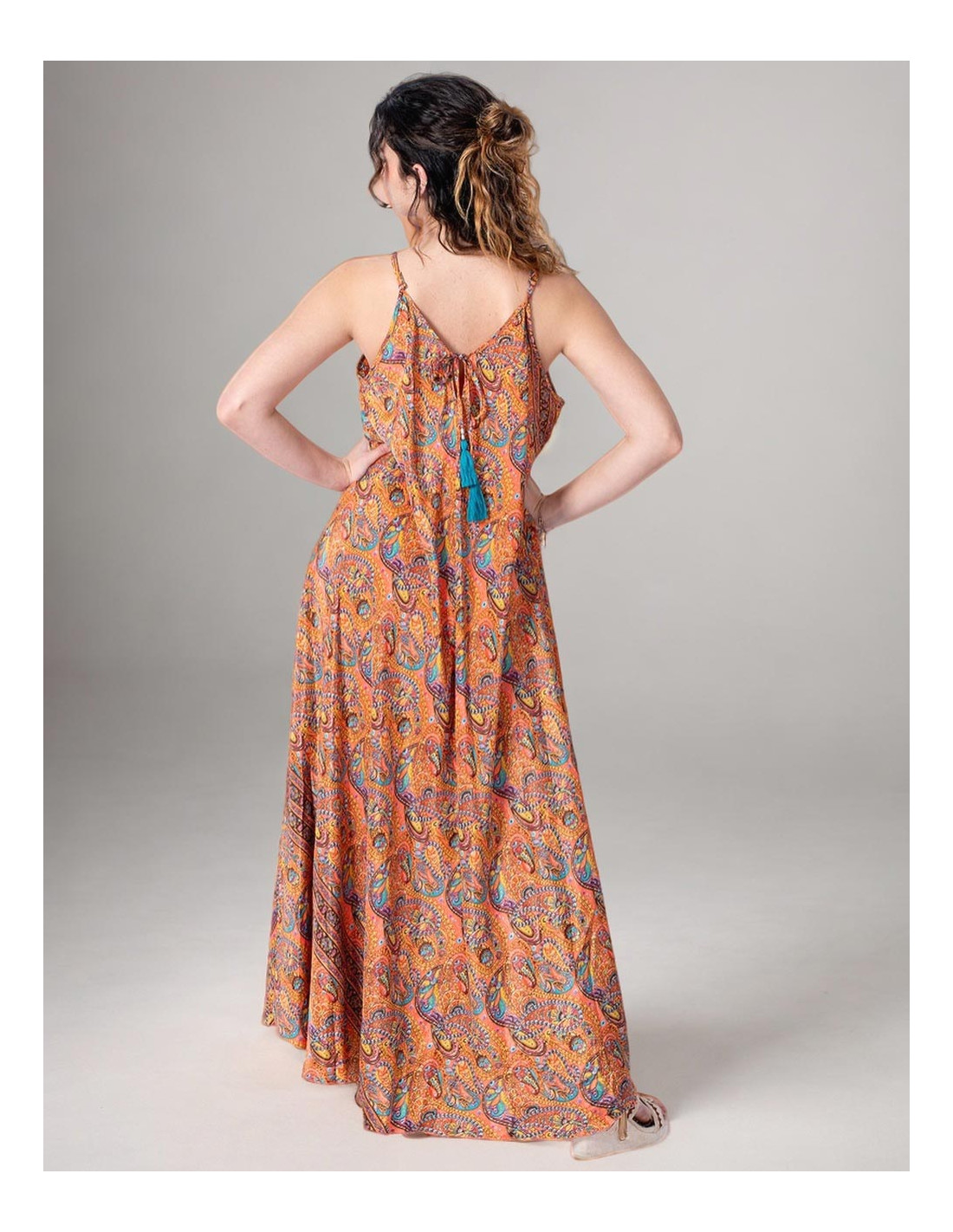 Long jumpsuit with boho style printed with a beige background and drawings inside squares