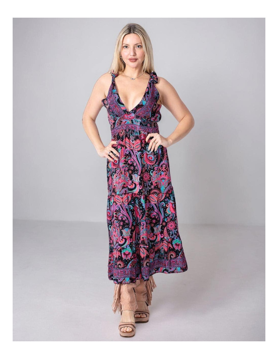 Printed dress with ruffles and open back made of silk with a blue background and drawings in various colors It belongs to the collection with the project: