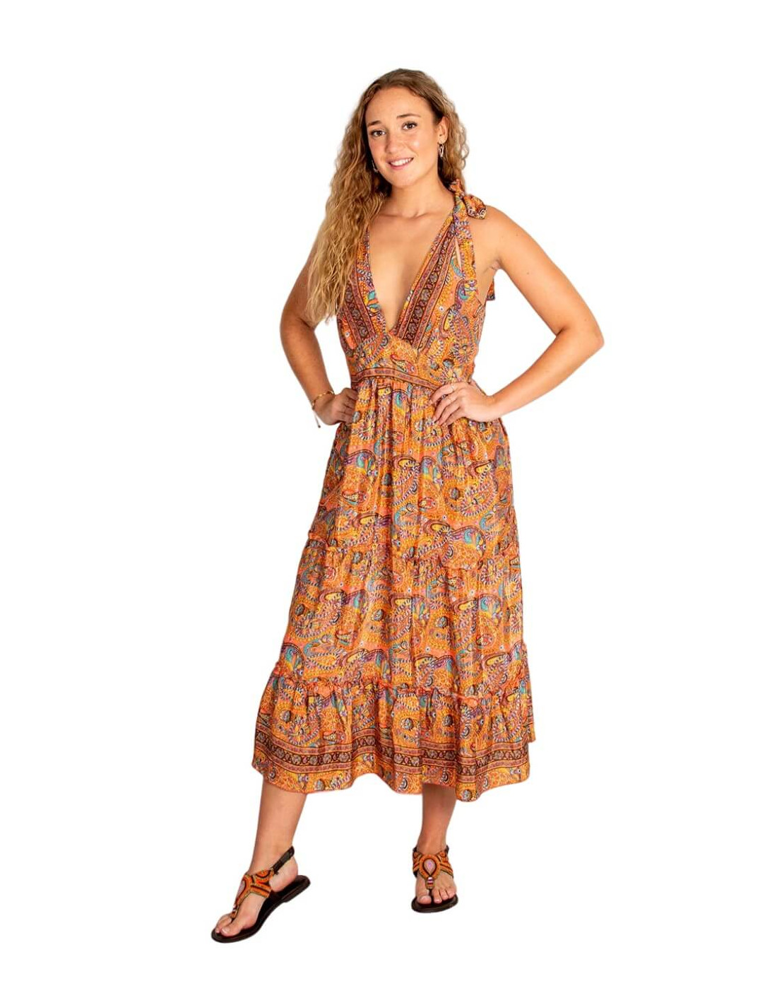 The ruffled hem adds a bohemian and feminine touch. Printed on an orange background with blue patterns, it's ideal for those looking for an authentic, unique, hippie-chic dress steeped in Indian culture. Measurements: Approx. 129 cm.