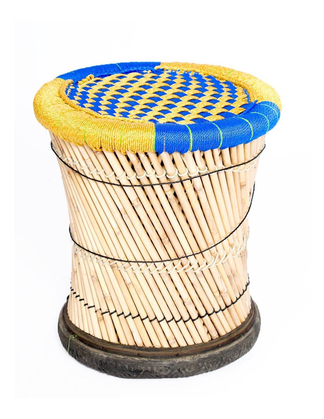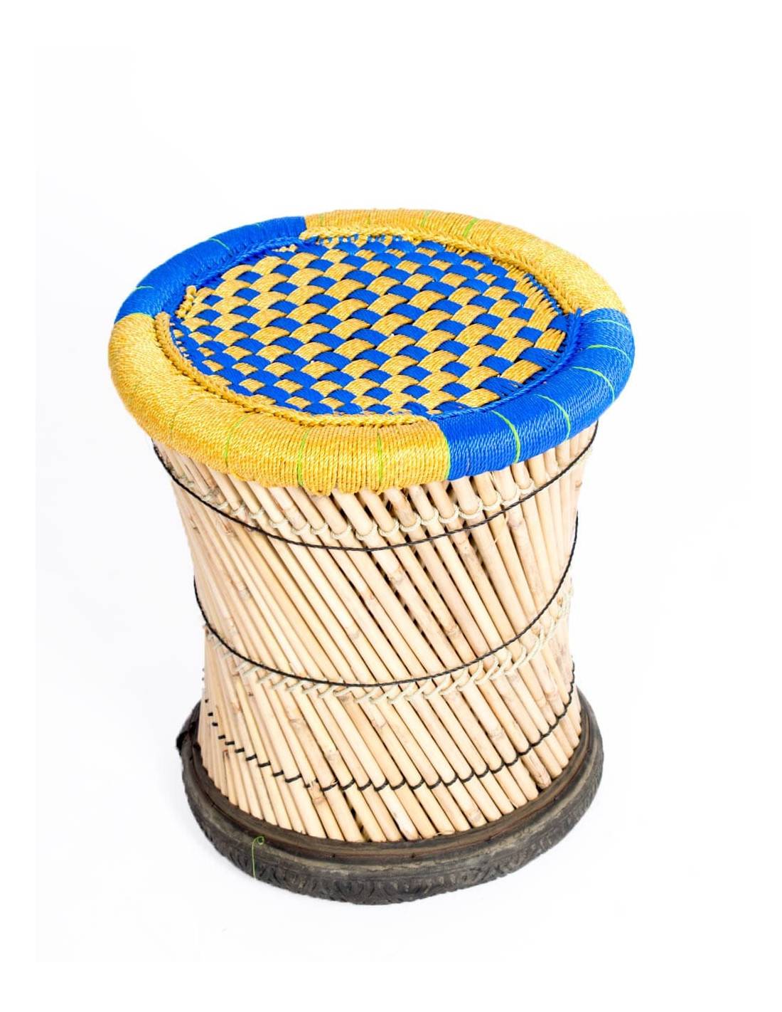 Stool from India, made of bamboo with a woven seat in blue and yellow.
