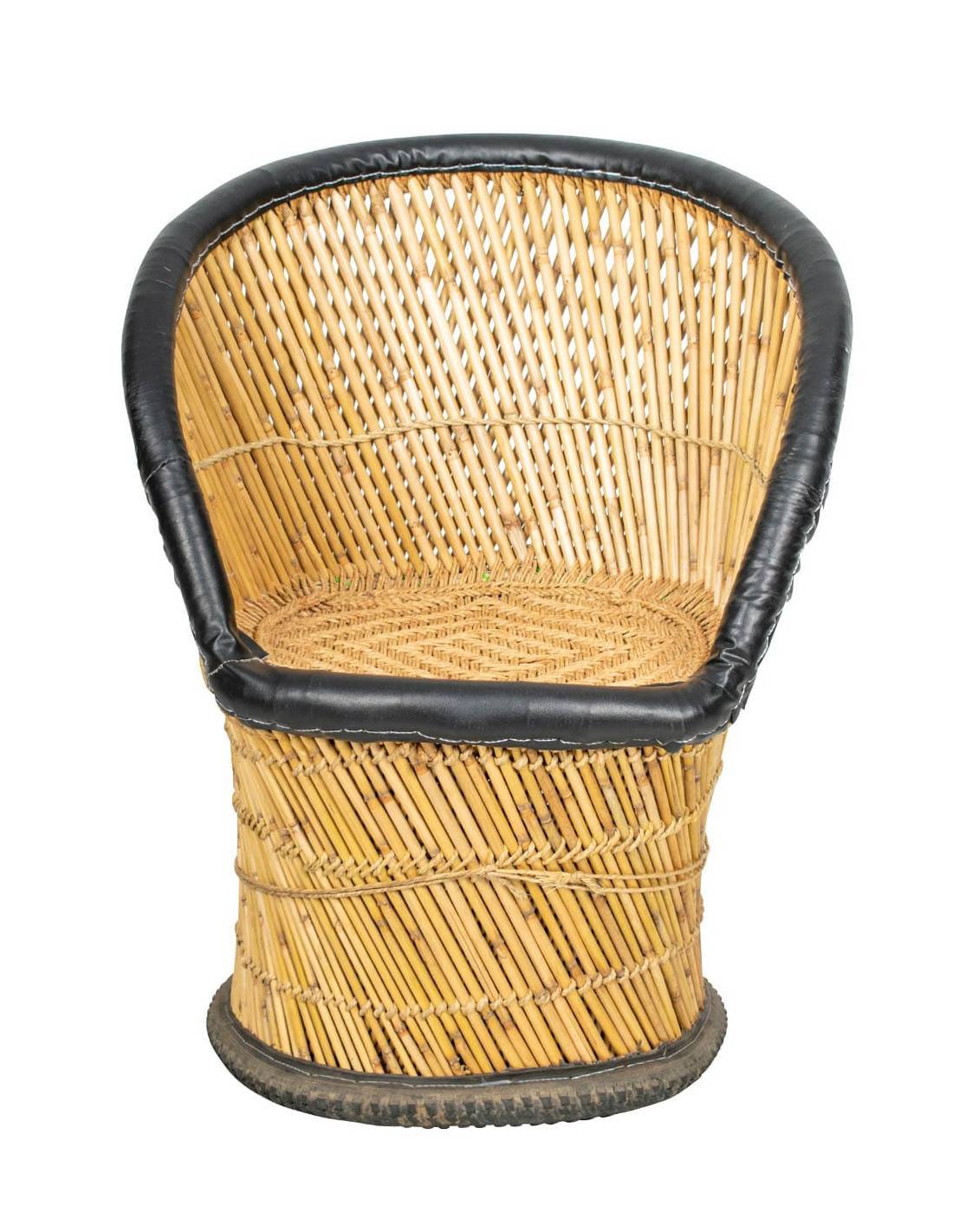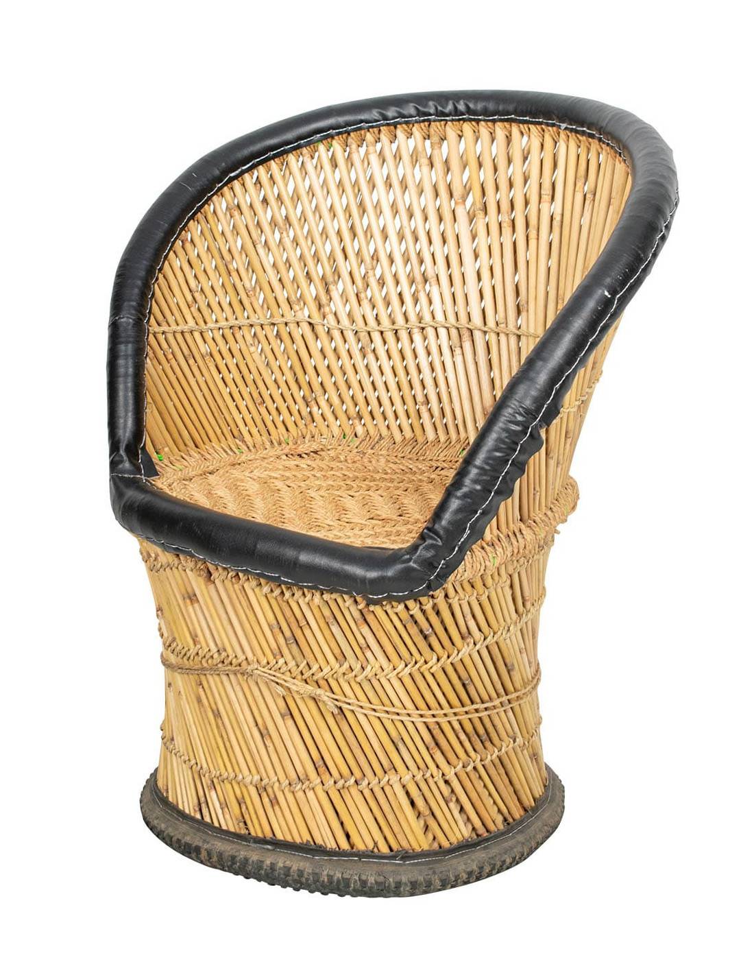 Large armchair made of jute in a natural color with a dark imitation leather edge