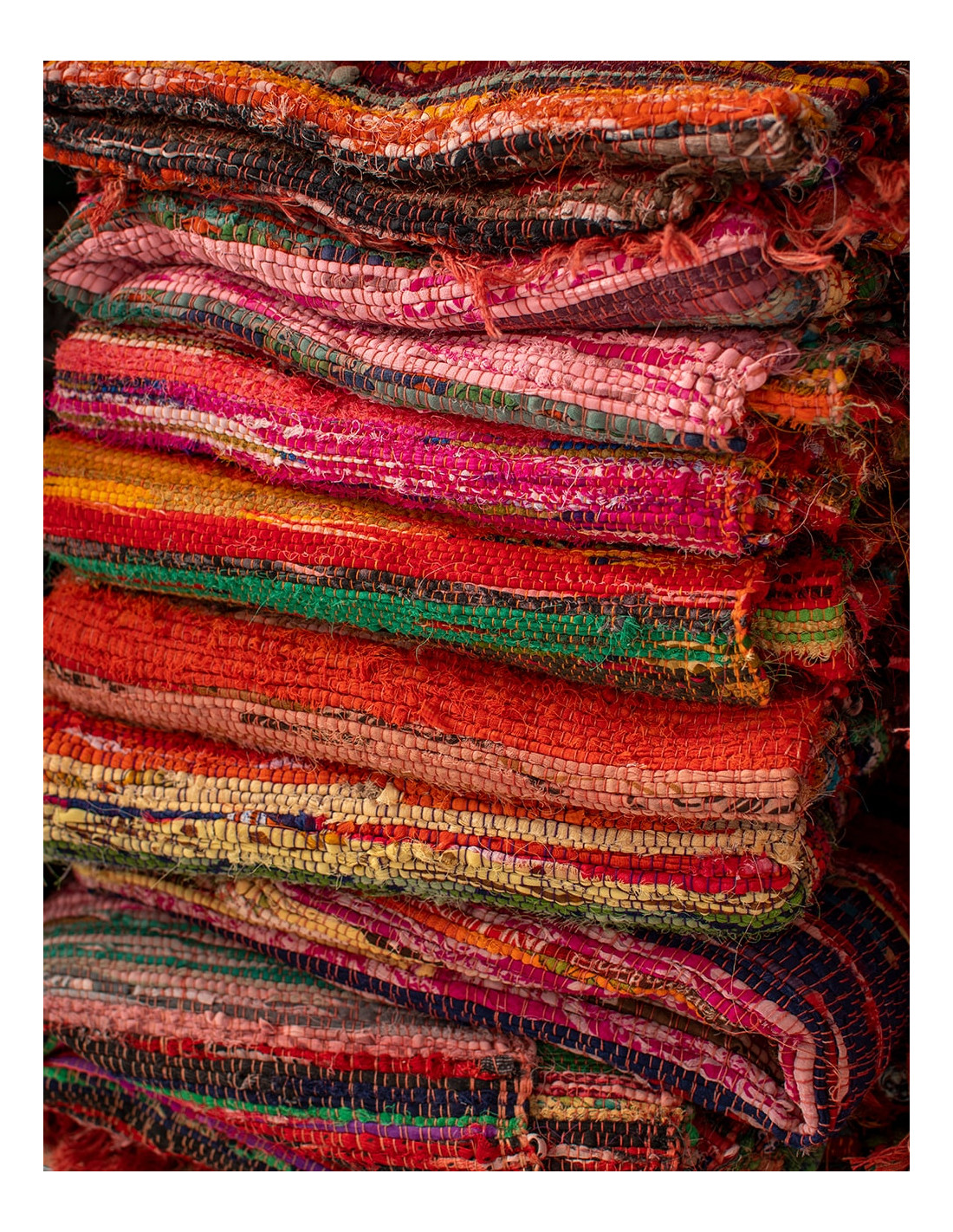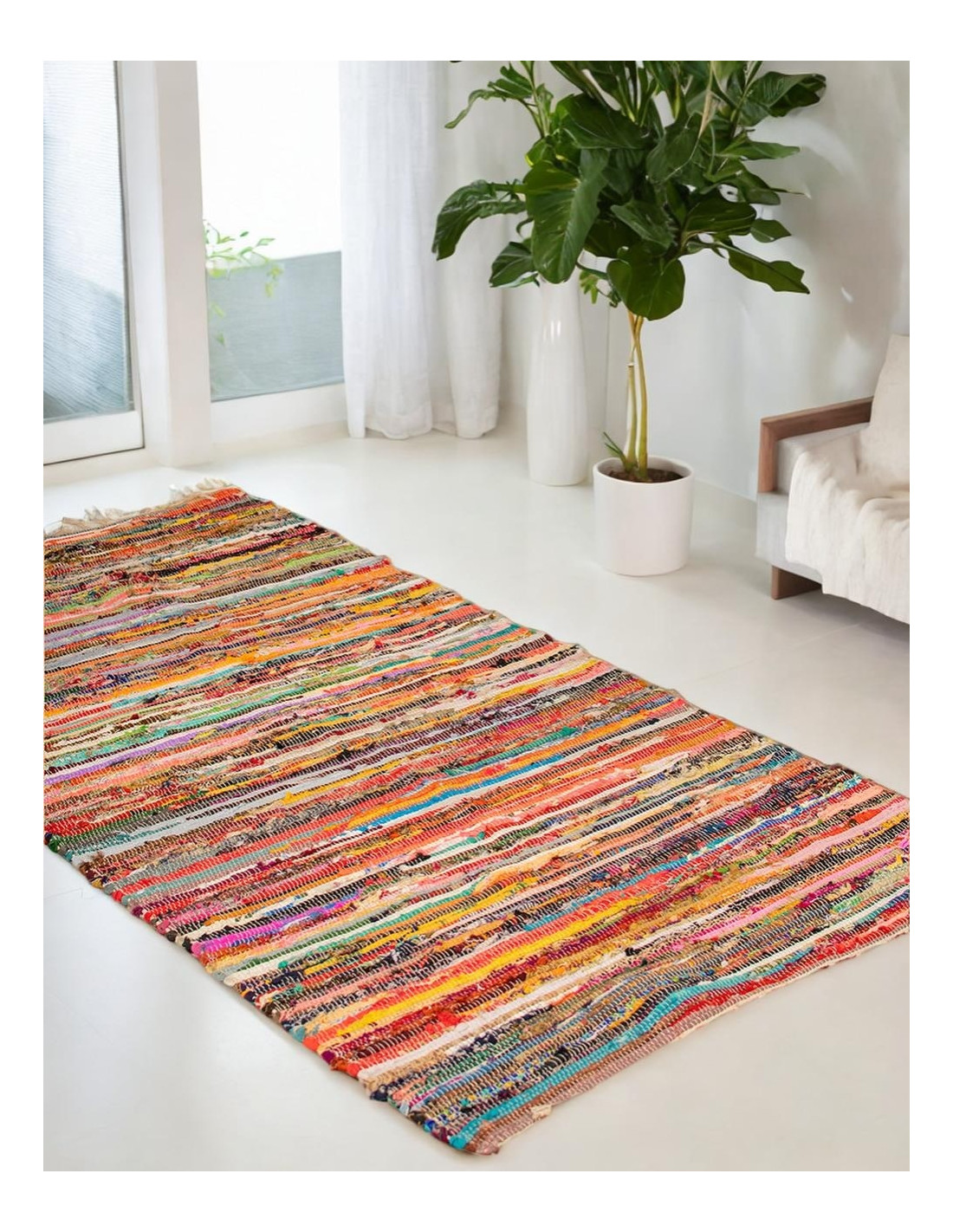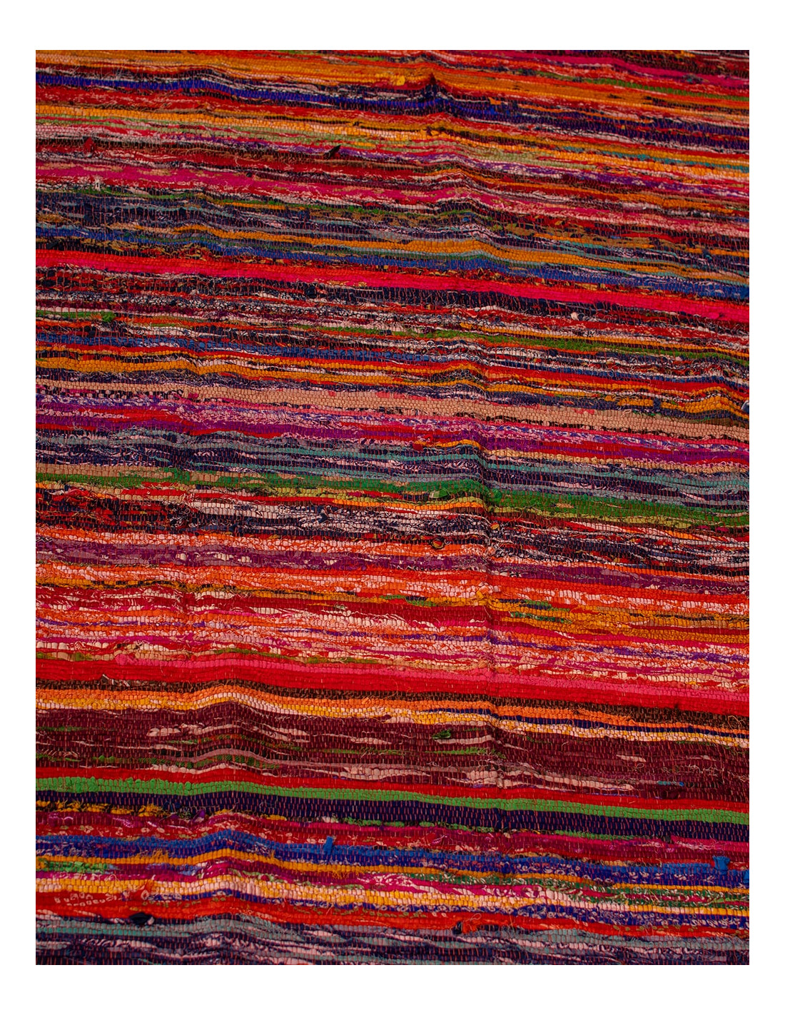 Crafted in India from interwoven yarns and fabrics, each rug features a unique blend of colors, ensuring no two are alike. Its large size (1x2 m) and thin thickness make it a versatile option for decorating homes, shops, or commercial spaces with an authentic and cultural touch.
