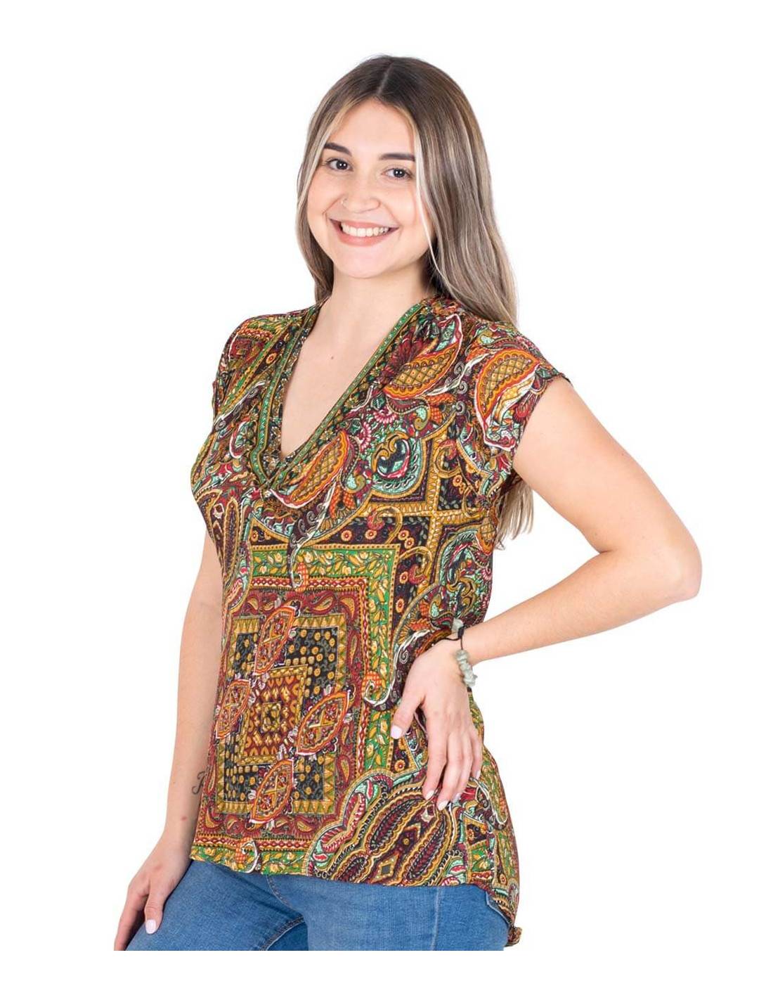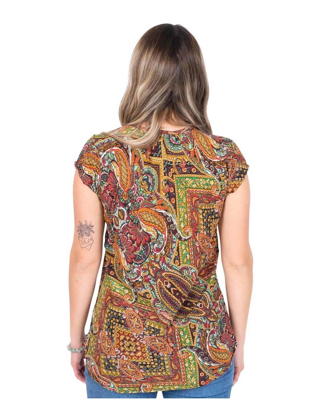 Set of top and short skirt made of silk, the prevailing color is salmon with drawings in various colors, including yellow and light blue.