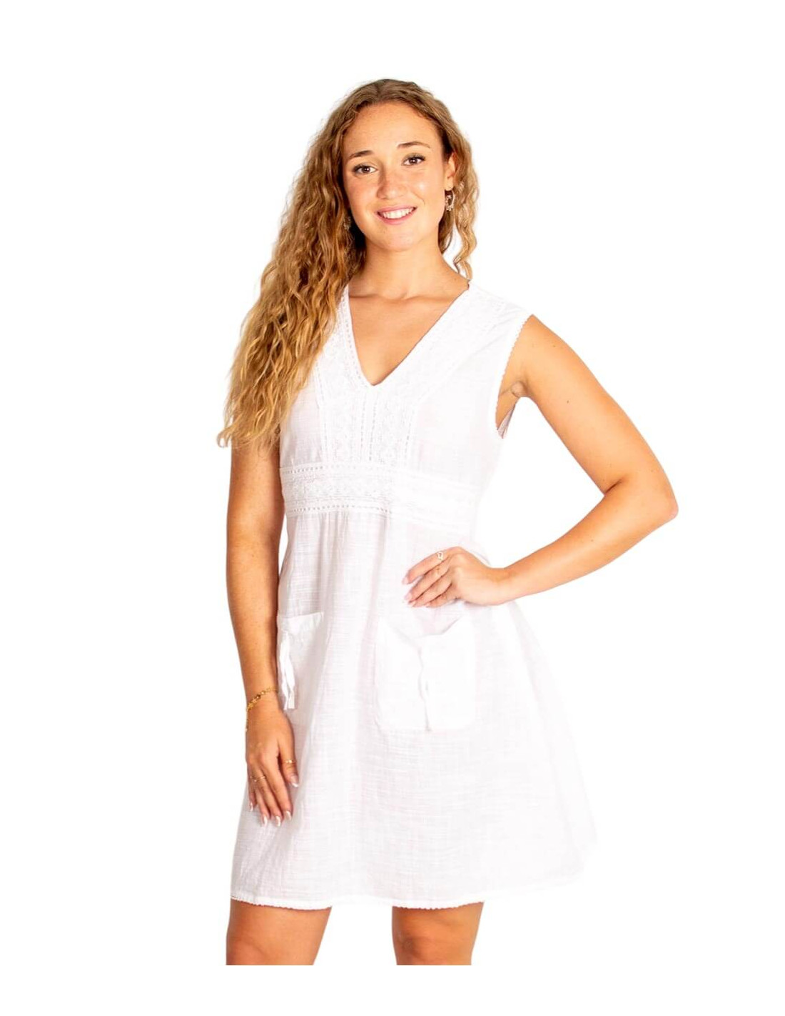 Sleeveless white cotton dress with boho and embroidered details. Lightweight, with pockets and a V-neckline.
