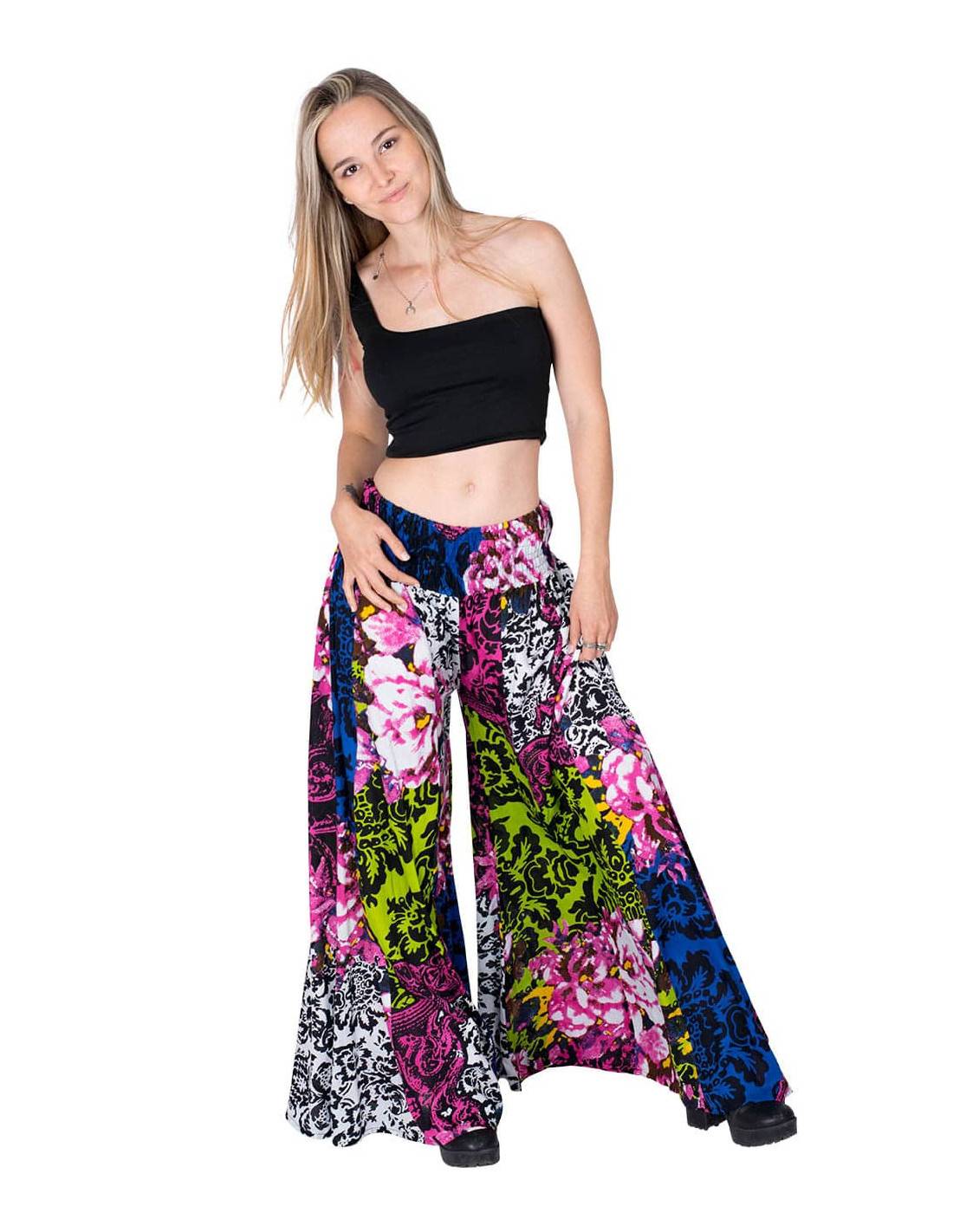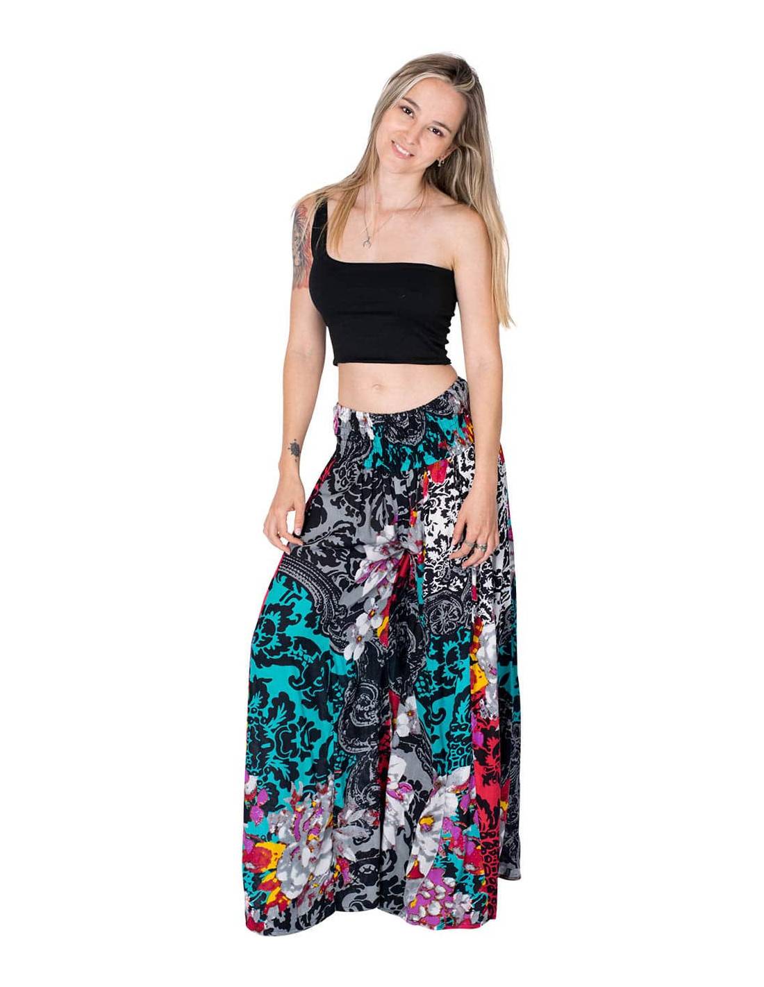 Very wide mid-rise skirt trousers with a wide rubber waist printed with flower drawings in different colors of your choice