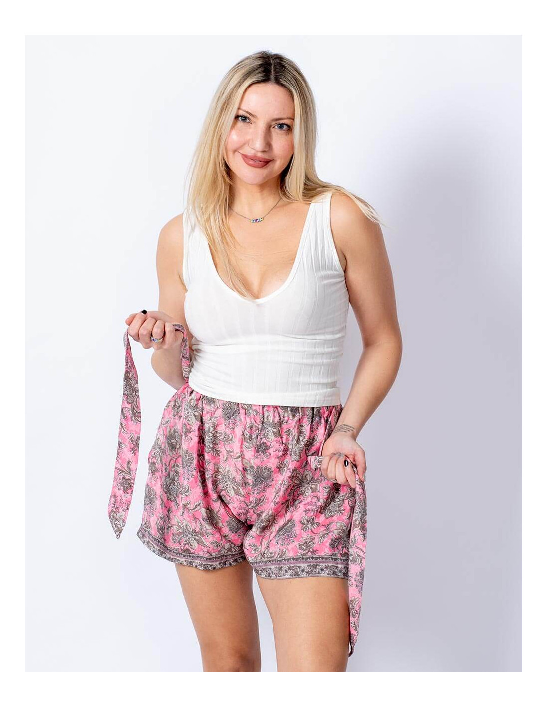 Fresh and comfortable shorts made of printed silk in orange tones with drawings in blue and other colors It belongs to the collection with the project: