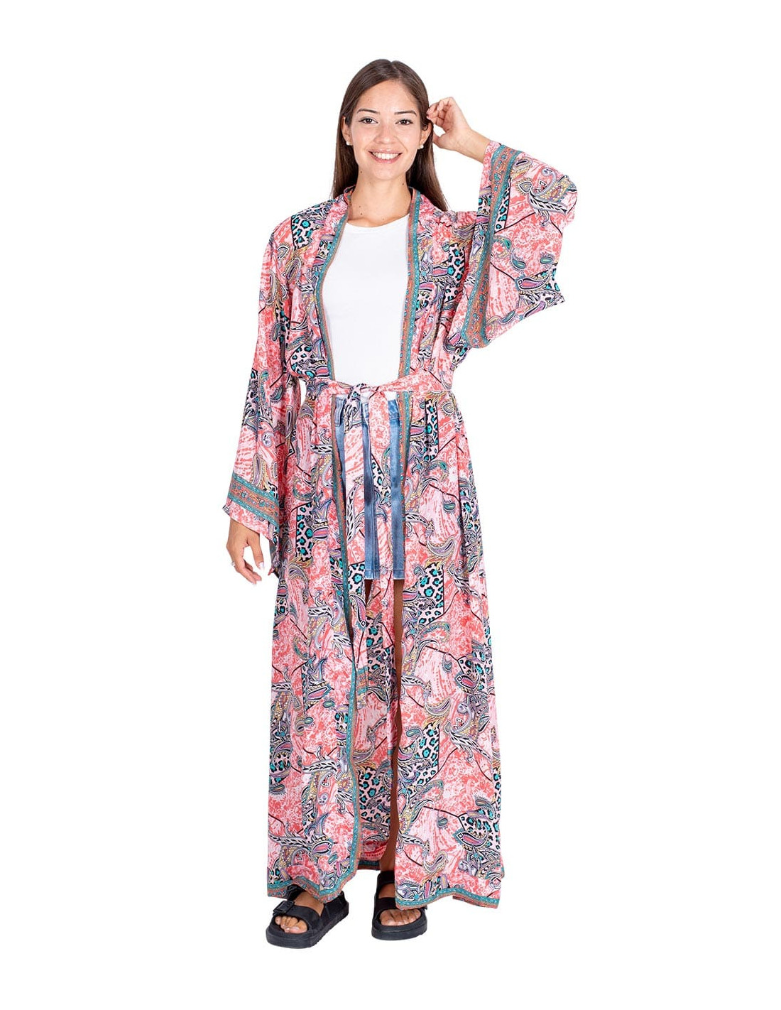 Long jumpsuit with boho style printed with a beige background and drawings inside squares