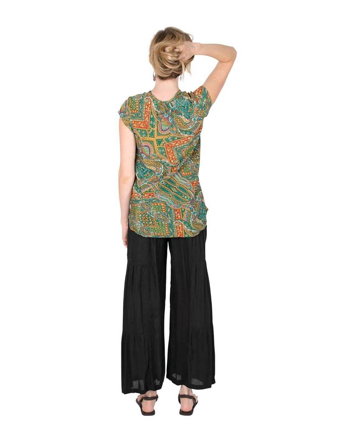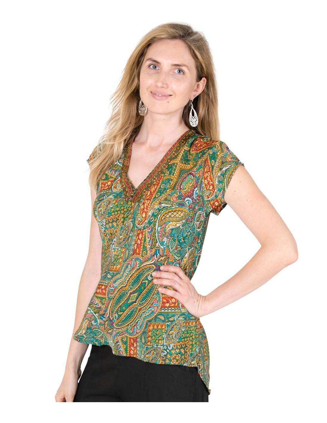 Long silk dress with two side slits and straps. Printed with light blue background and drawings in blue, green and orange among others