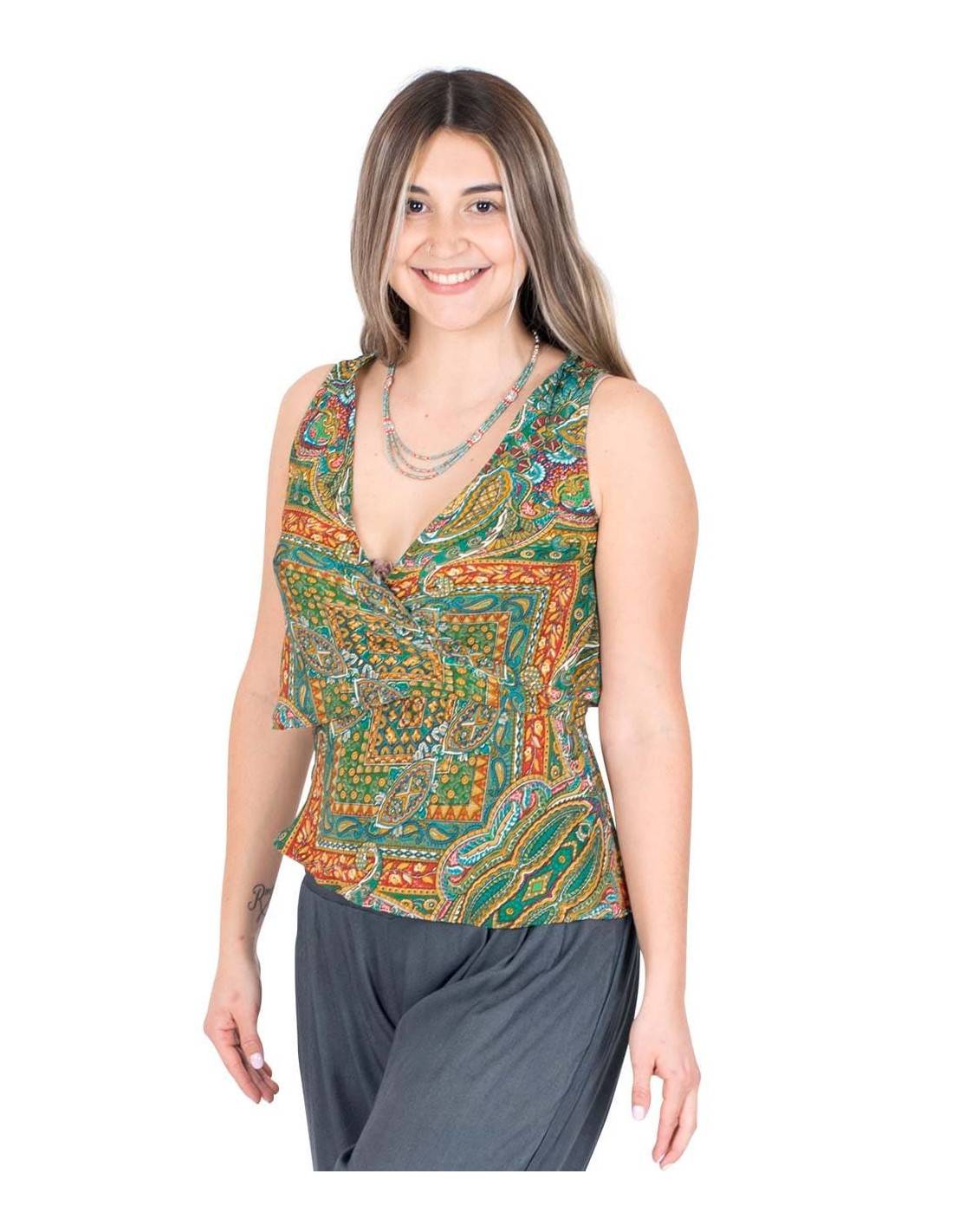 Long dress with short sleeves, V-neck and princess cut with ruffles underneath