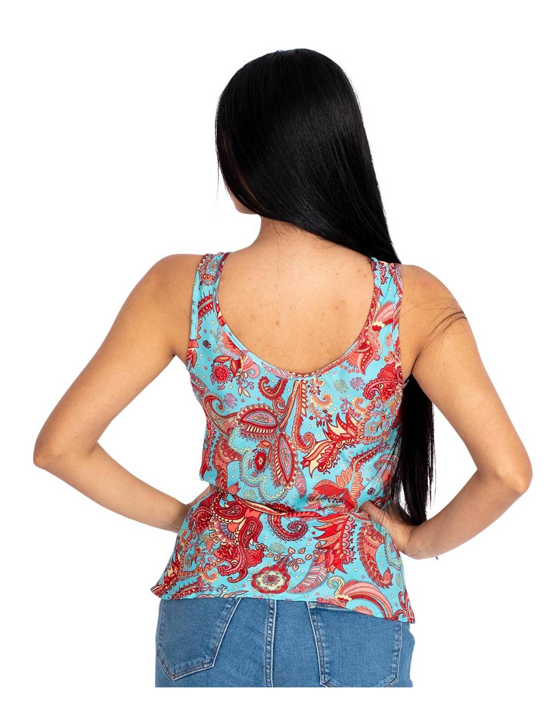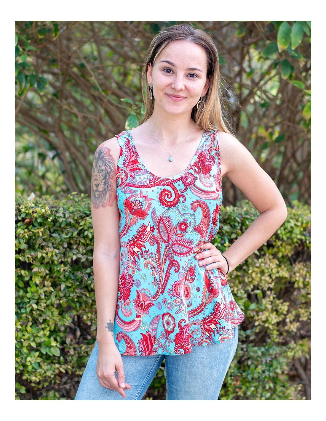 Silk wrap blouse with 3/4 sleeves. Printed in light blue tones