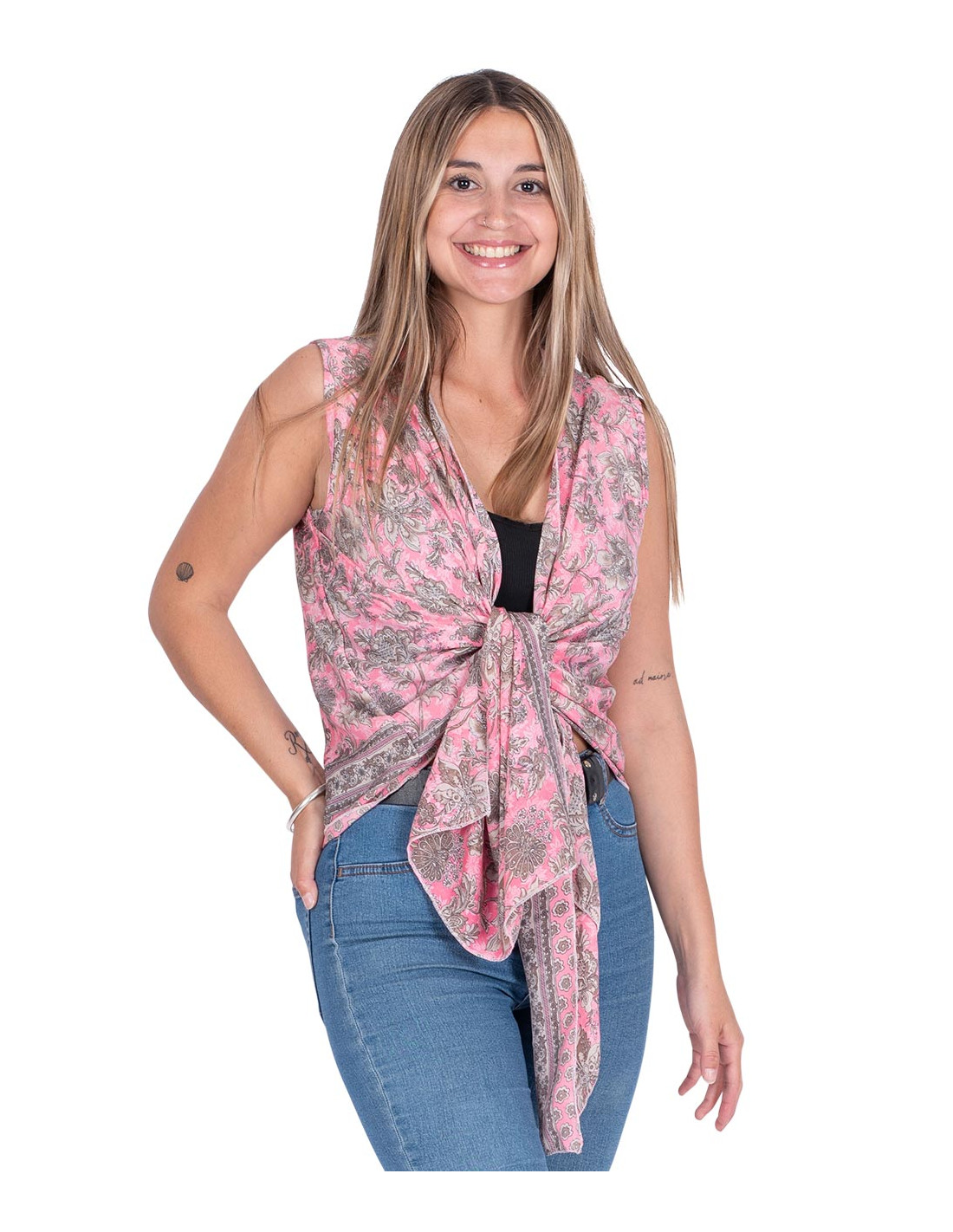 Dresses Bow Dress MVE3007E Short silk dress with adjustable straps and a bow under the chest. The base color is pink and it has drawings in other colors View