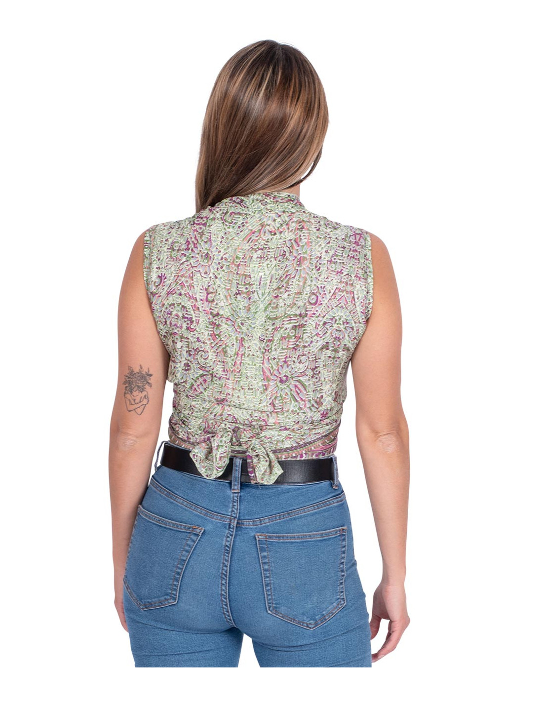 Longer vest style top at front, can be worn loose, tied, alone or with a top underneath. Its pattern is green with details in salmon and purple.