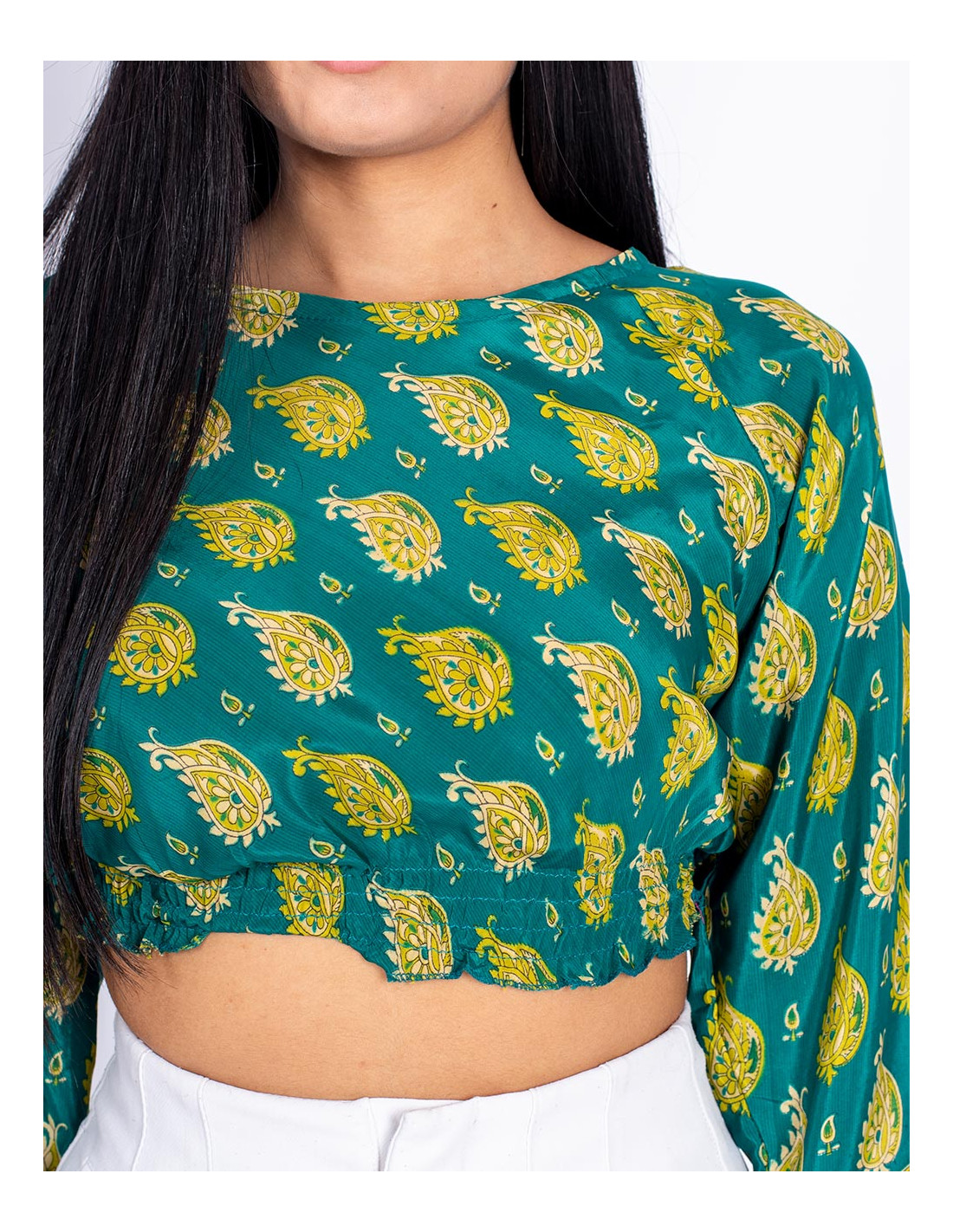 Short blouse with 3/4 sleeves, made of printed silk with a green background and yellow drawings