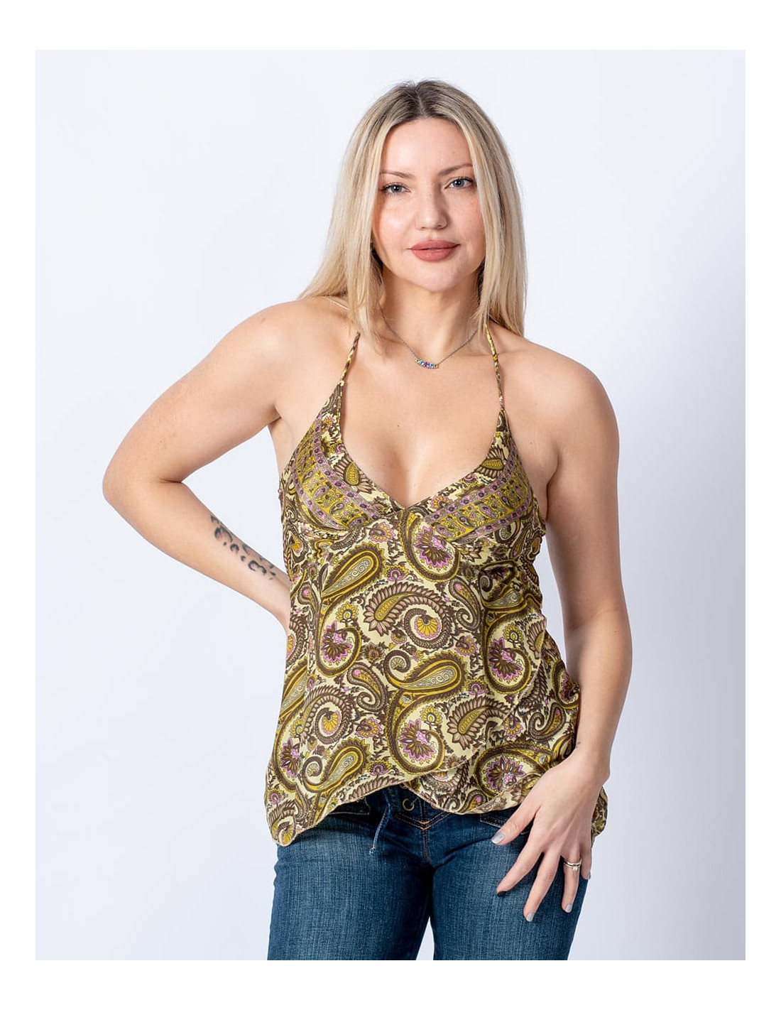 Short and wide jumpsuit made of printed silk. The background is blue and has a large number of drawings in brown and red tones.