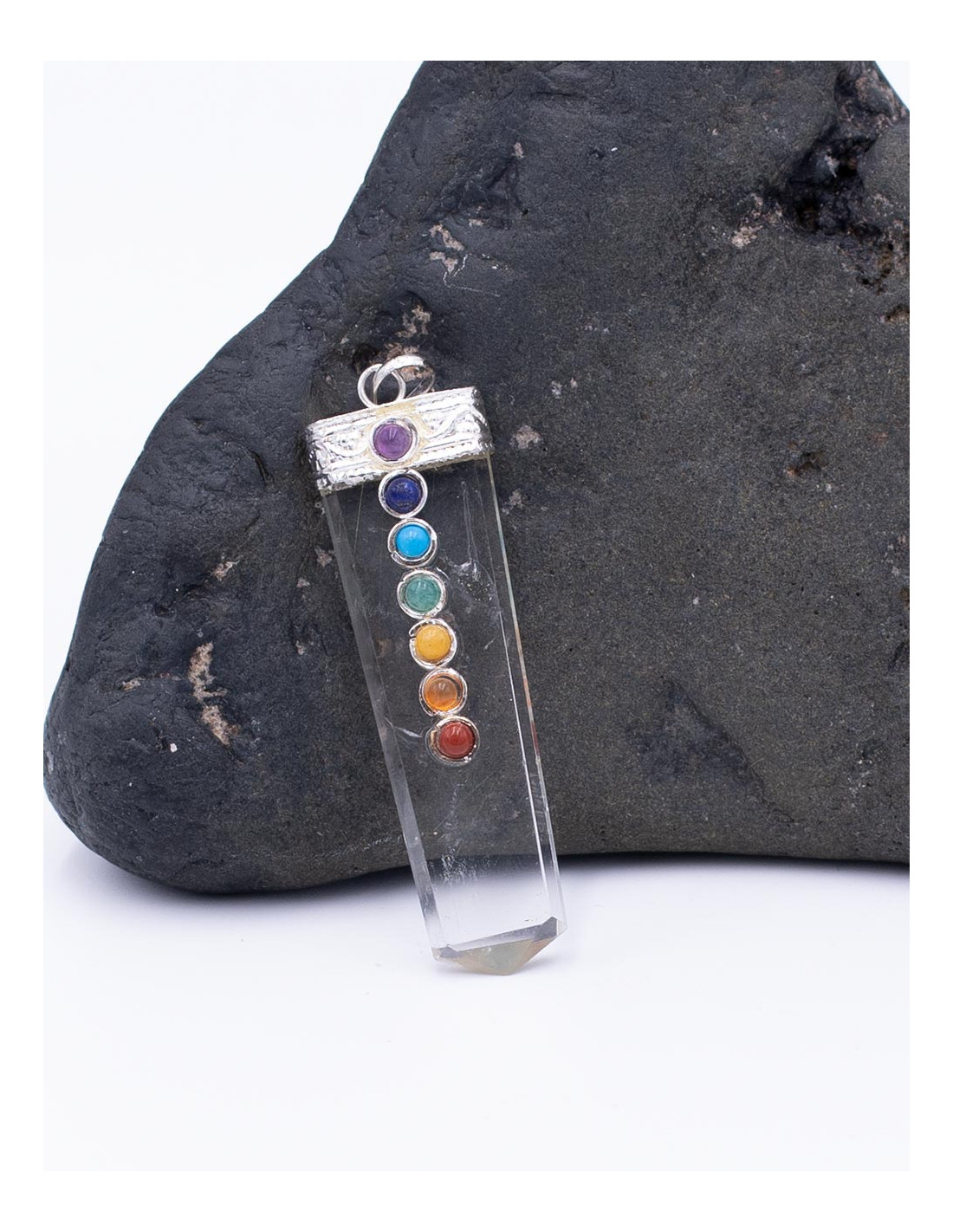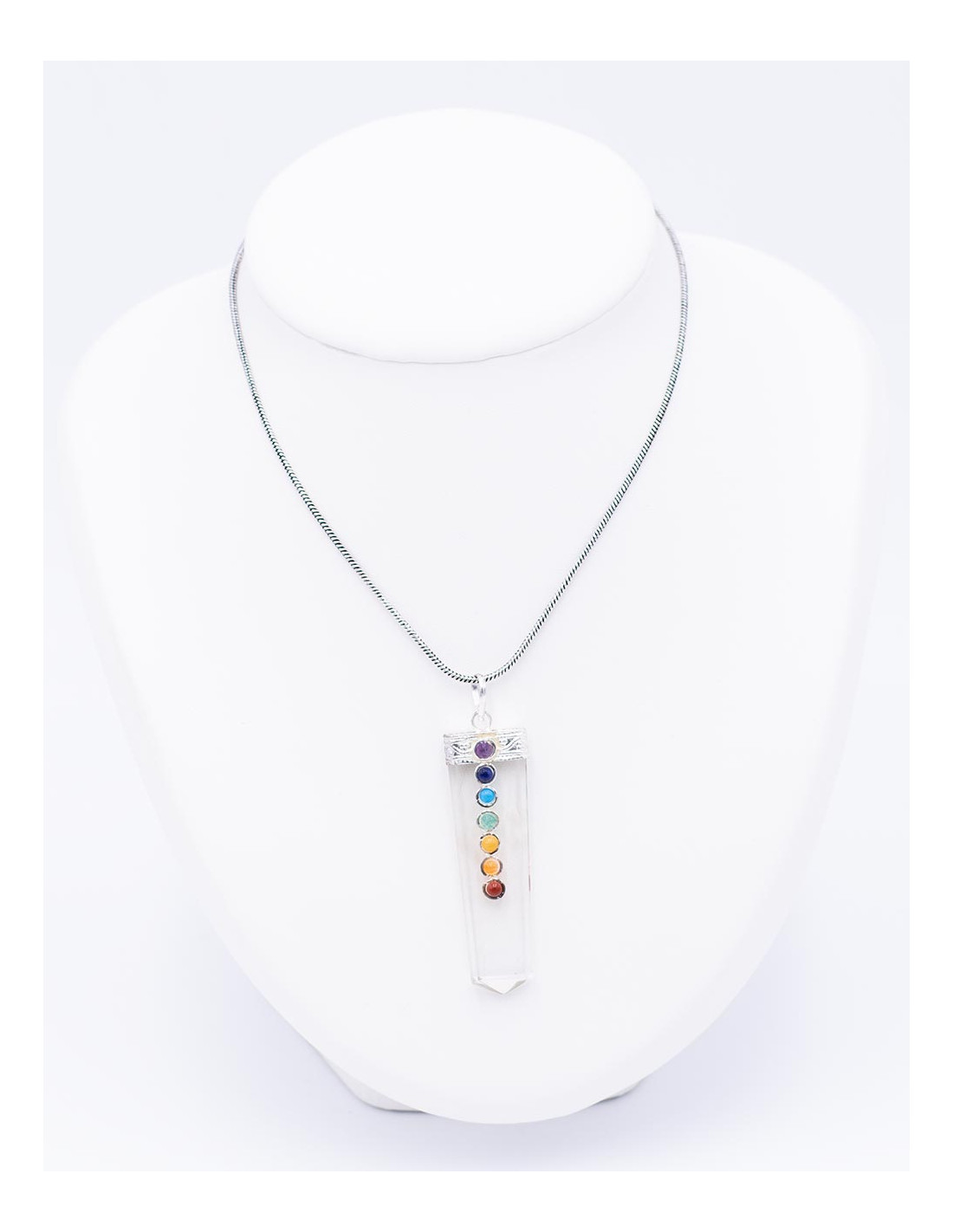 Quartz crystal mineral stone pendant in the shape of an inverted obelisk, set with stones from the 7 chakras on the front.