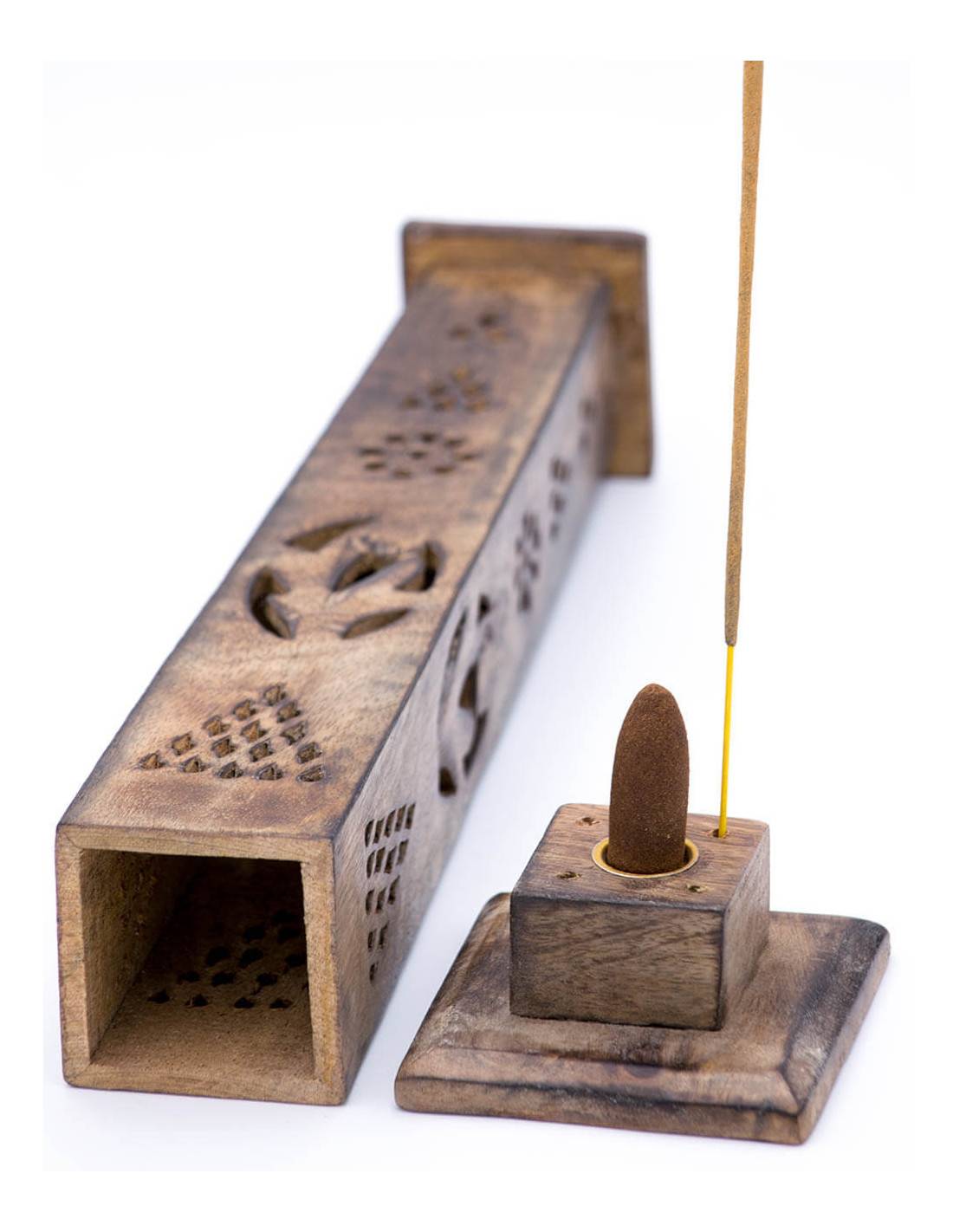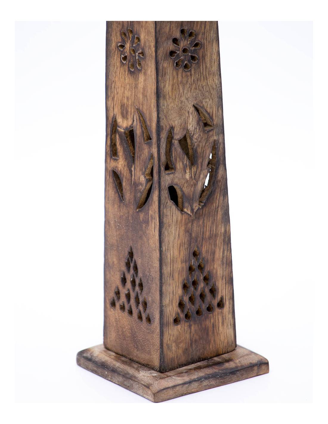 Censer in the form of a vertical tower of rustic wood with holes through which the aroma and smoke of the incense or cone is spread.