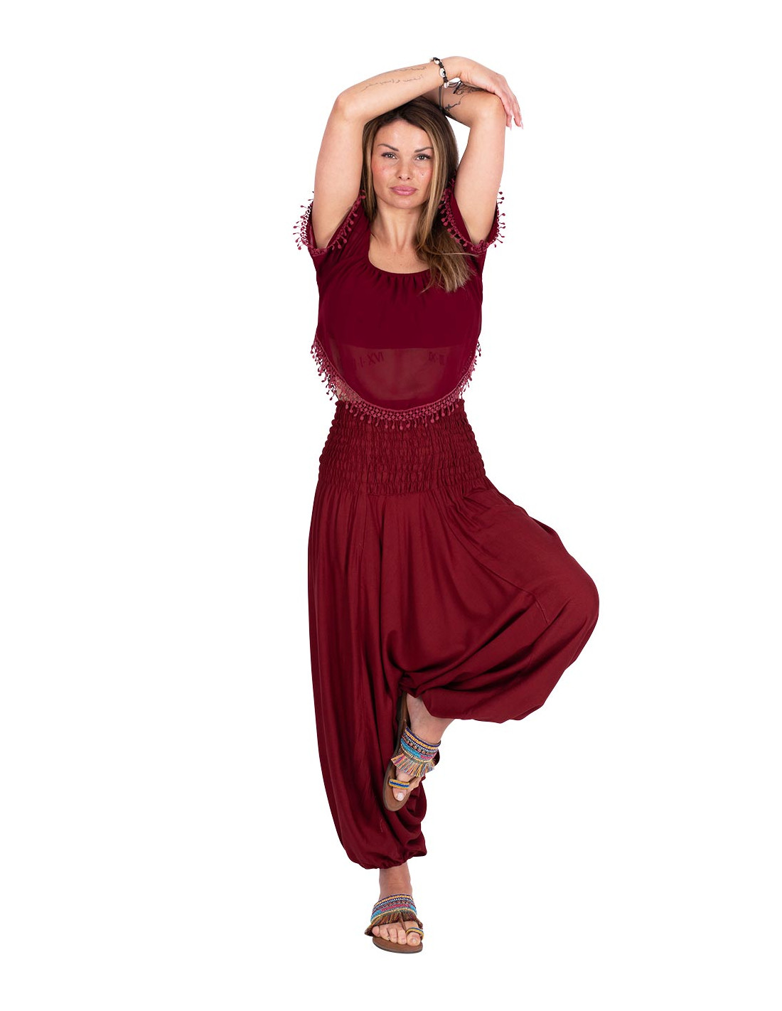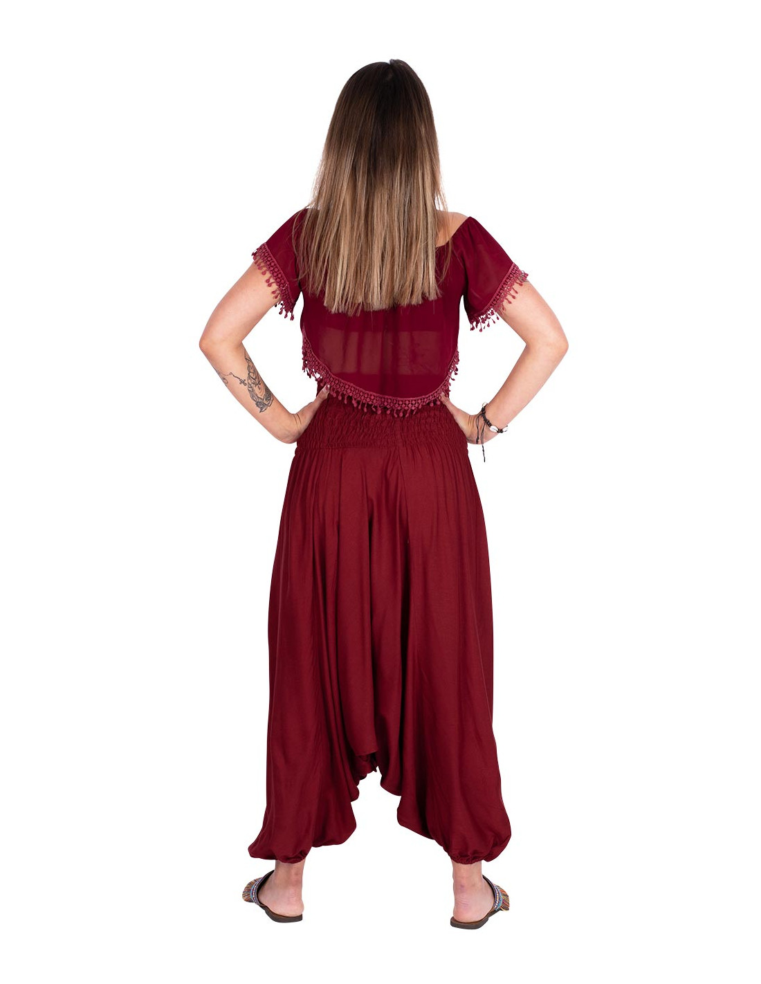 Cluth made of cotton with added embroidered fabrics of different colors and patterns. It has coins and decorative pompoms
