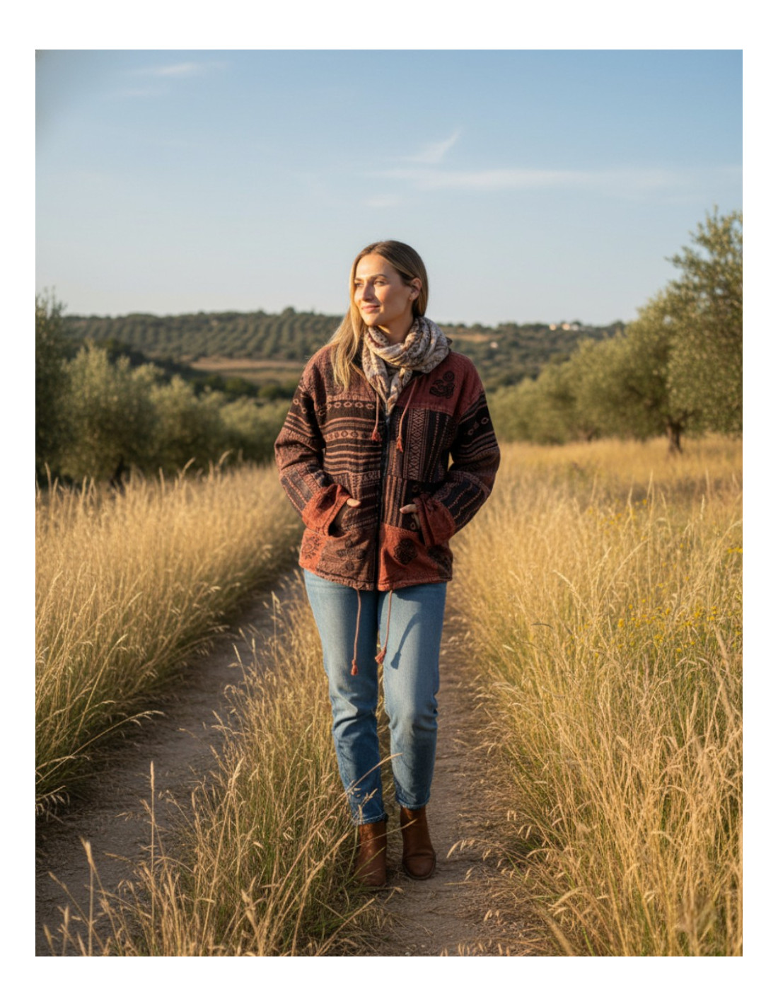 Handmade from recycled cotton fabrics, this garment features a colorful and textured design that reflects the essence of ethnic and boho fashion . Its fleece lining provides warmth and softness, perfect for chilly days.