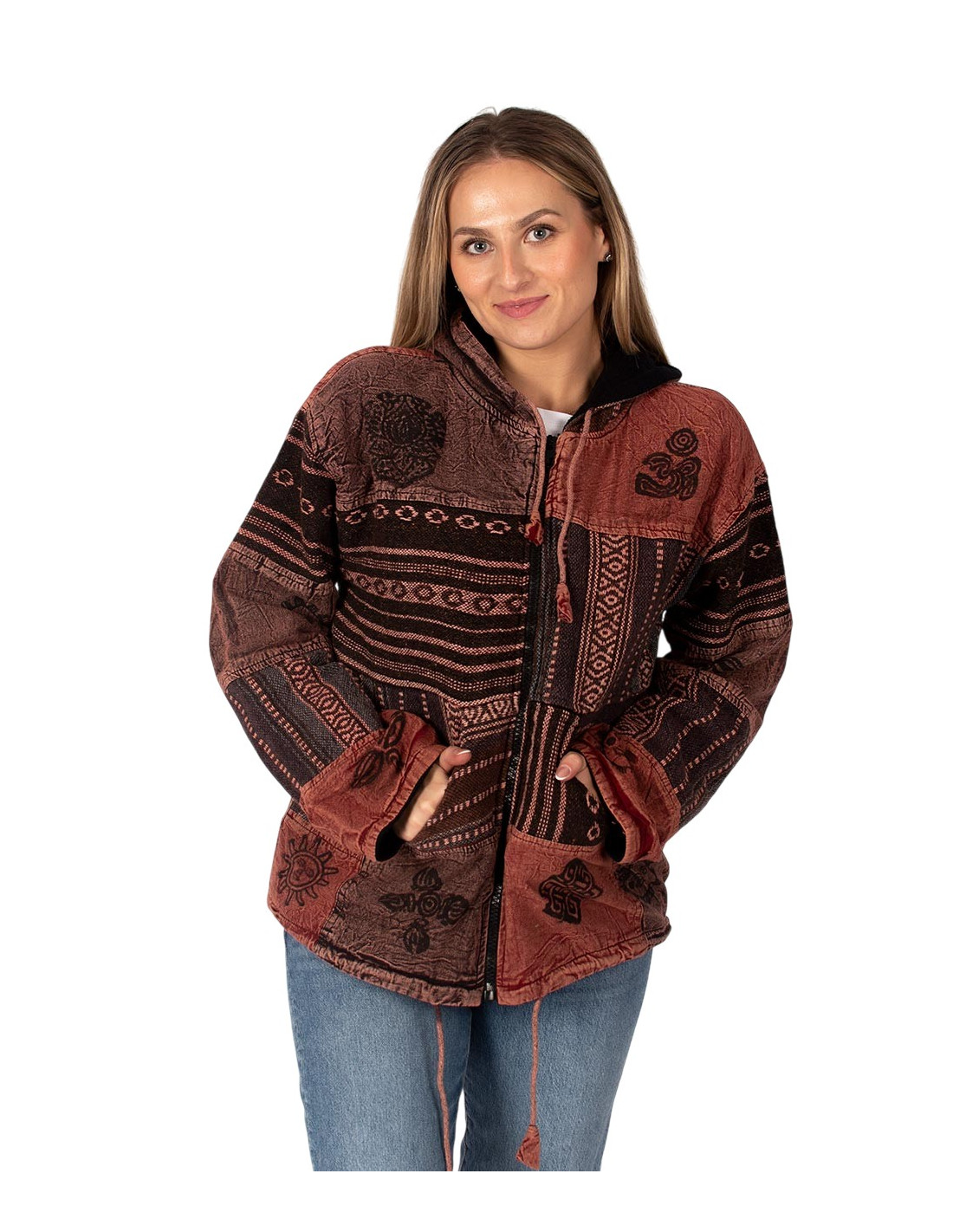 Unisex ethnic style jacket with fleece lining, hood and zipper.