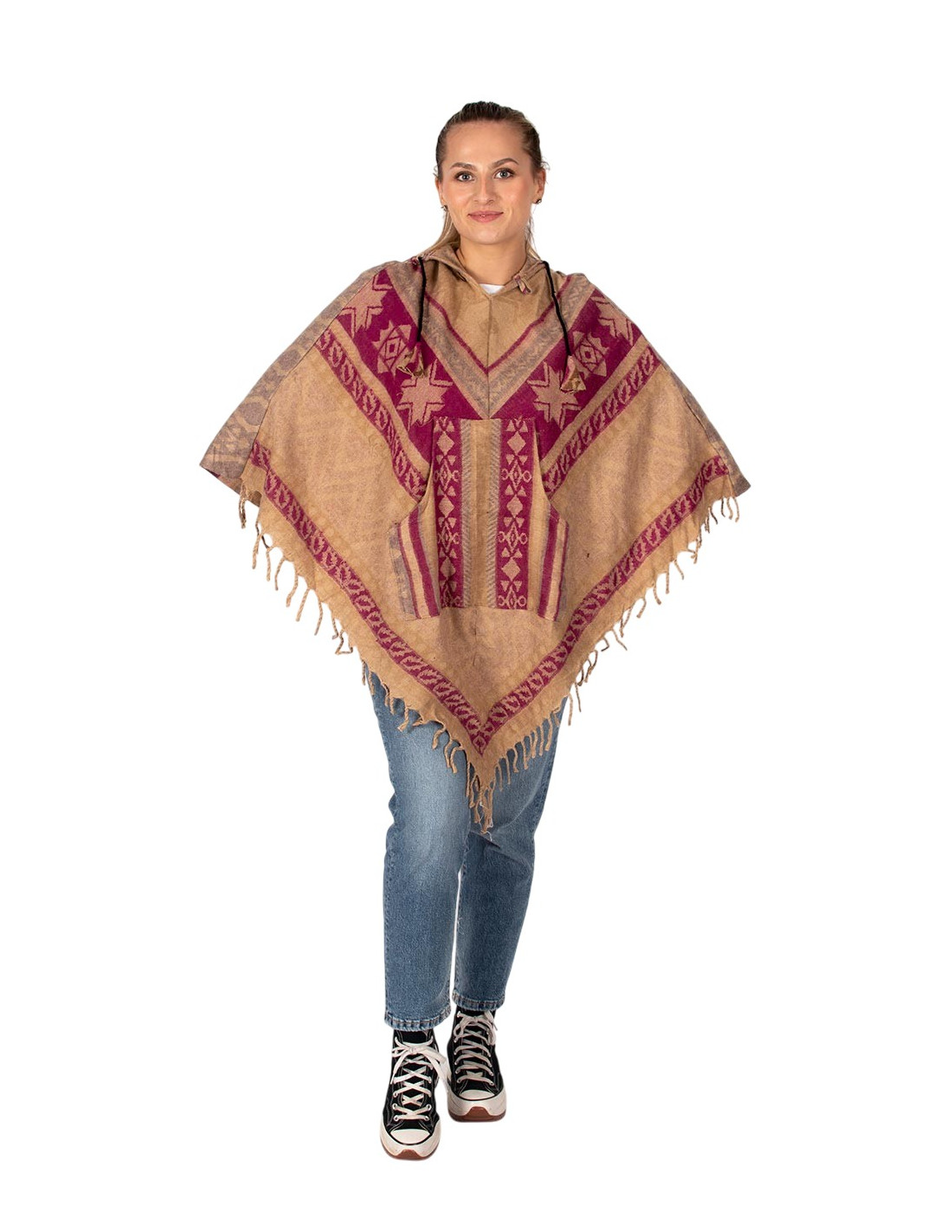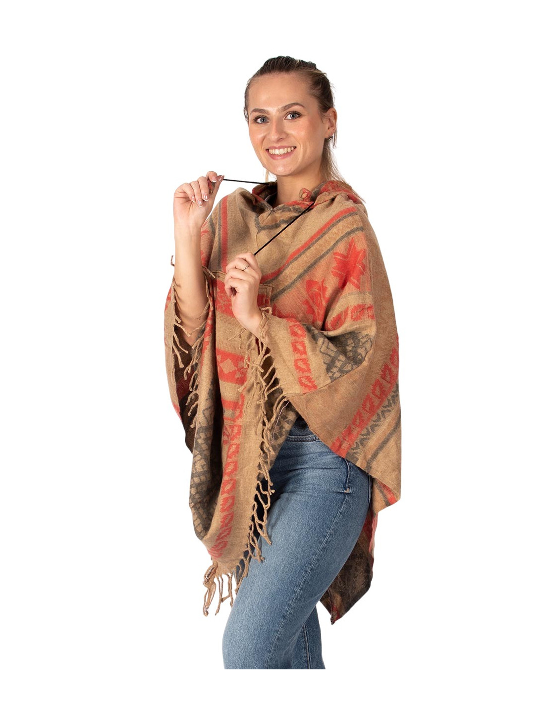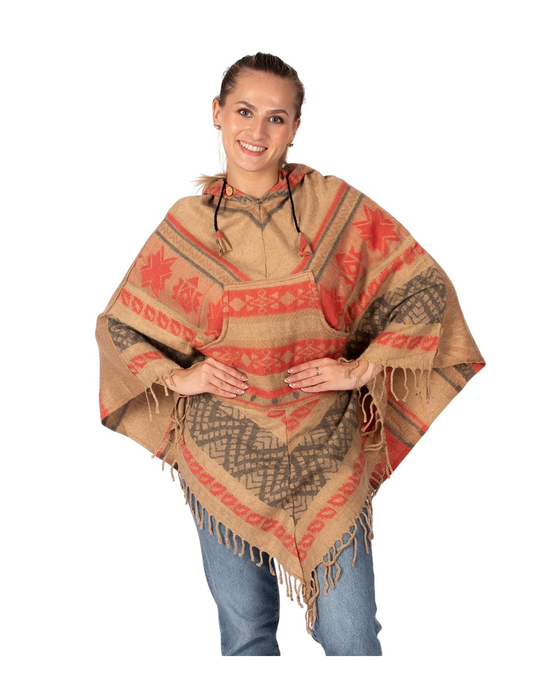 Kimago 's cotton-wool poncho reflects authentic Indian craftsmanship and the charm of contemporary ethnic fashion . Its design incorporates front fringe , attached pockets at the center , and a wooden button at the neckline , making it easy to put on and adding a natural touch. The adjustable hood with a drawstring, finished with woven details, offers comfort and a boho-chic style ideal for any occasion.
