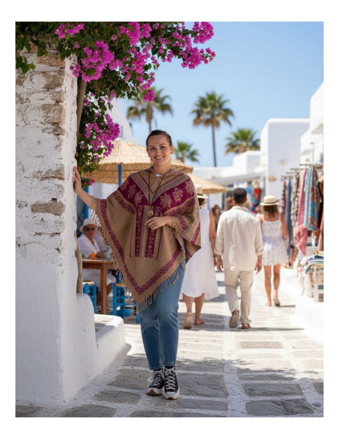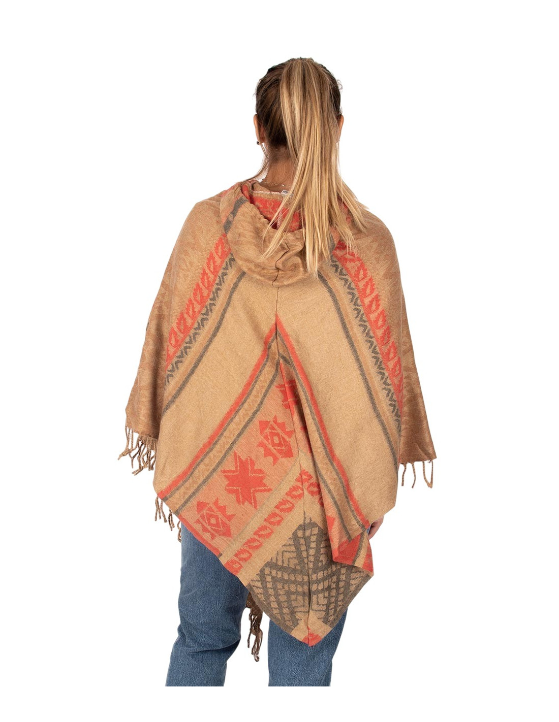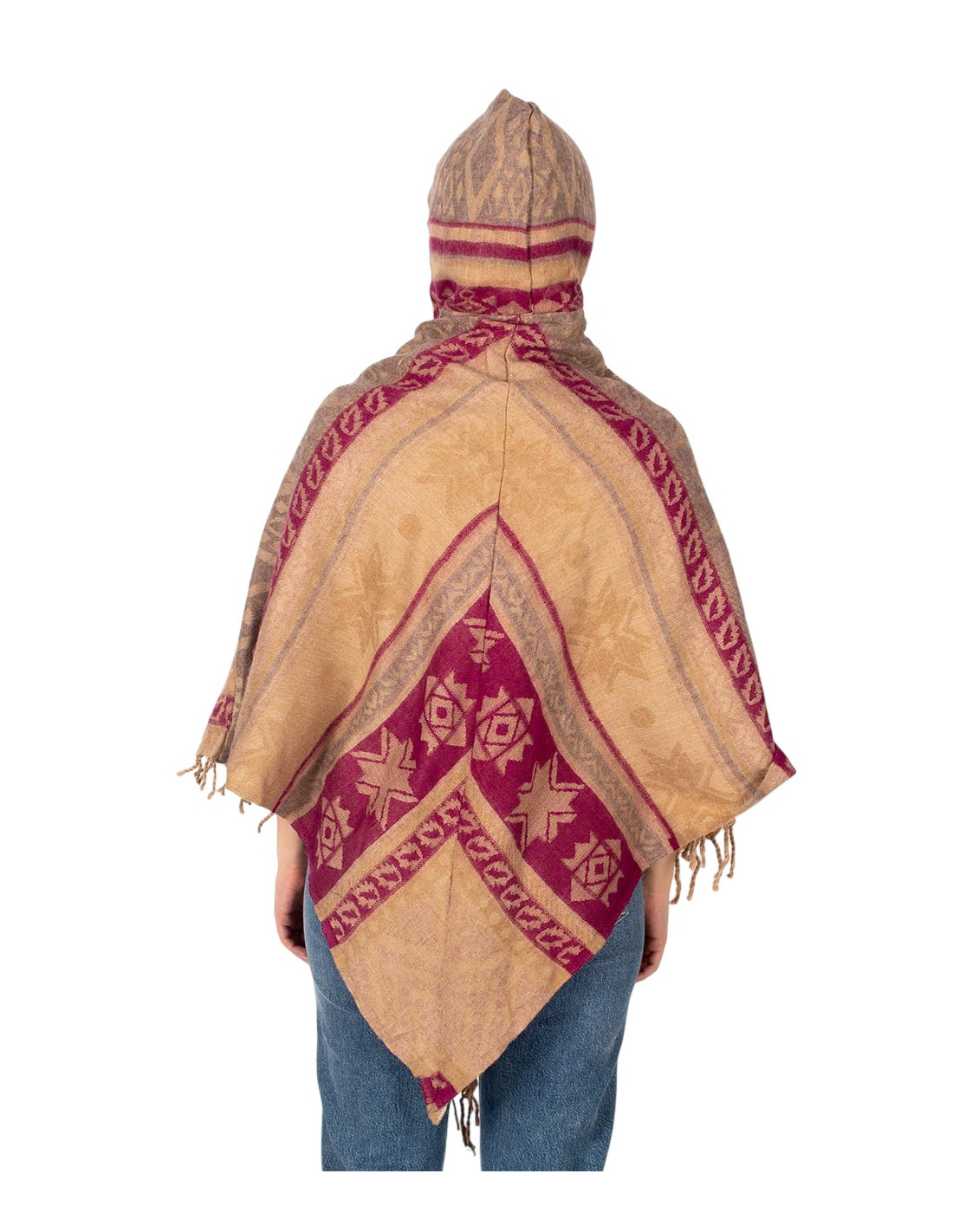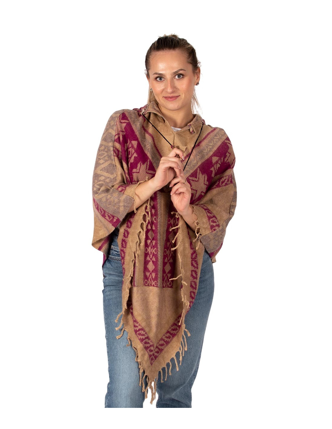 Kimago 's cotton-wool poncho reflects authentic Indian craftsmanship and the charm of contemporary ethnic fashion . Its design incorporates front fringe , attached pockets at the center , and a wooden button at the neckline , making it easy to put on and adding a natural touch. The adjustable hood with a drawstring, finished with woven details, offers comfort and a boho-chic style ideal for any occasion.