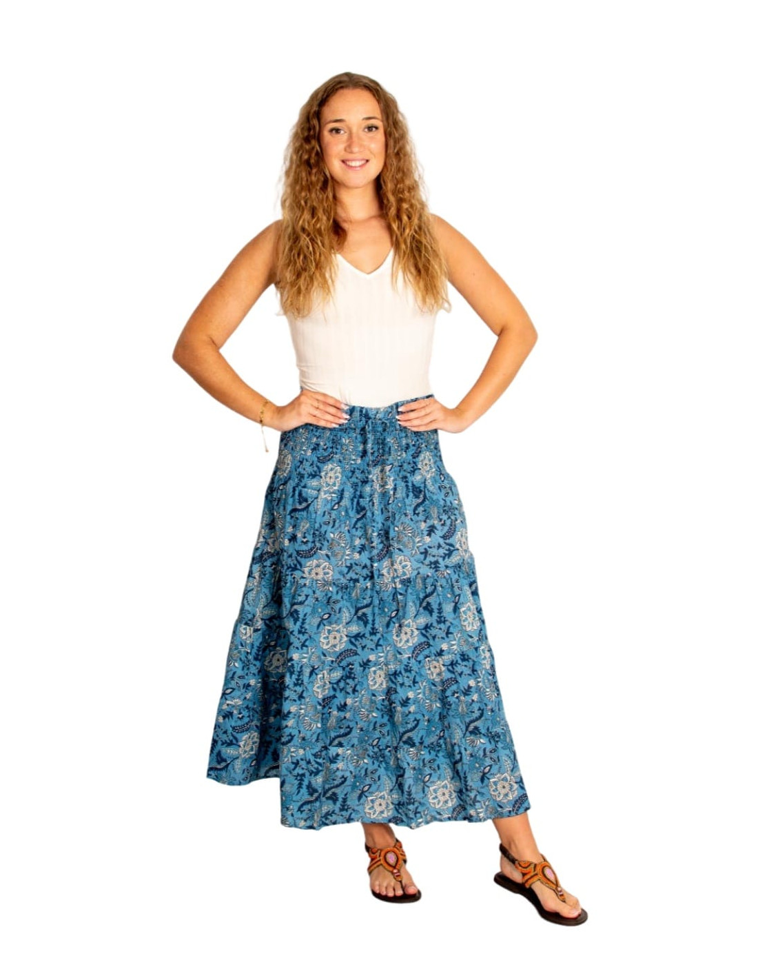 Long cotton skirt with a blue and white floral print. Comfortable, flowing, and versatile for year-round ethnic style.