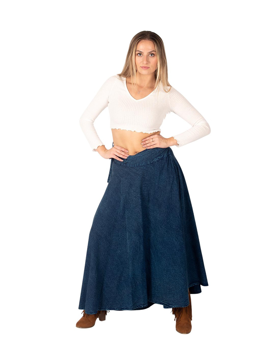 Long, wraparound cotton skirt in a faded blue hue. Ethnic boho style, comfortable and adaptable.