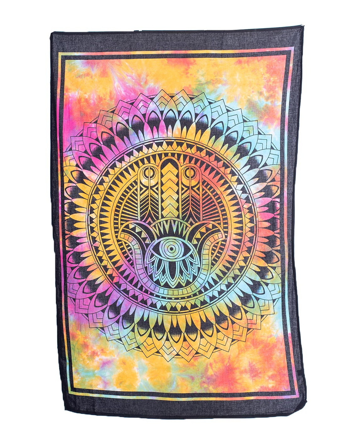 Multicolor tapestry with tie-dye background and black drawing of Hamsa hand