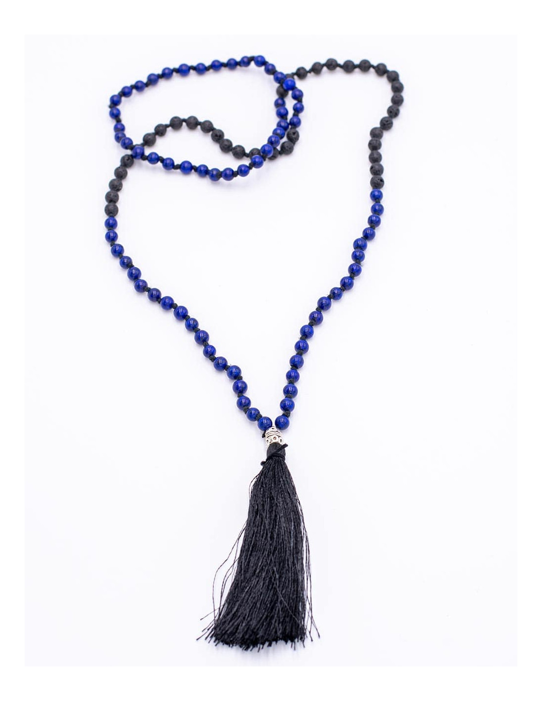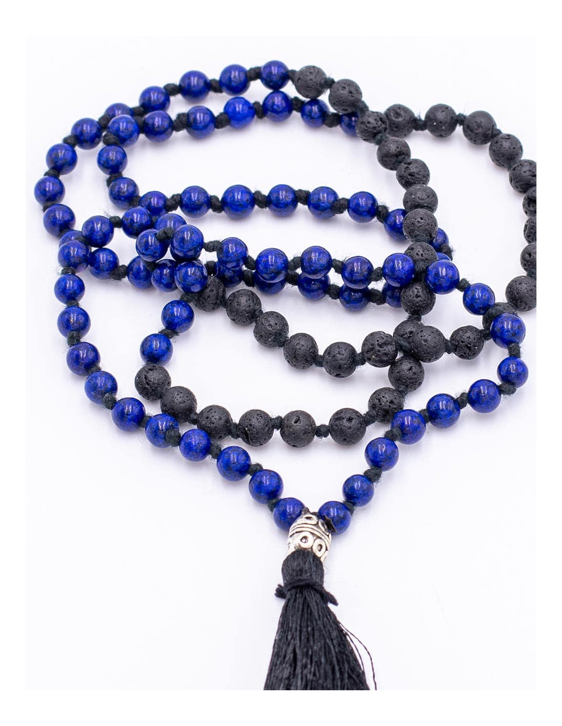 To facilitate prayer, it has two different stones, arranged in this way: 18 lapis lazuli stones, then 18 volcanic rock stones, then 36 lapis lazuli stones, followed by 18 volcanic rock stones, ending with 18 lapis lazuli stones.