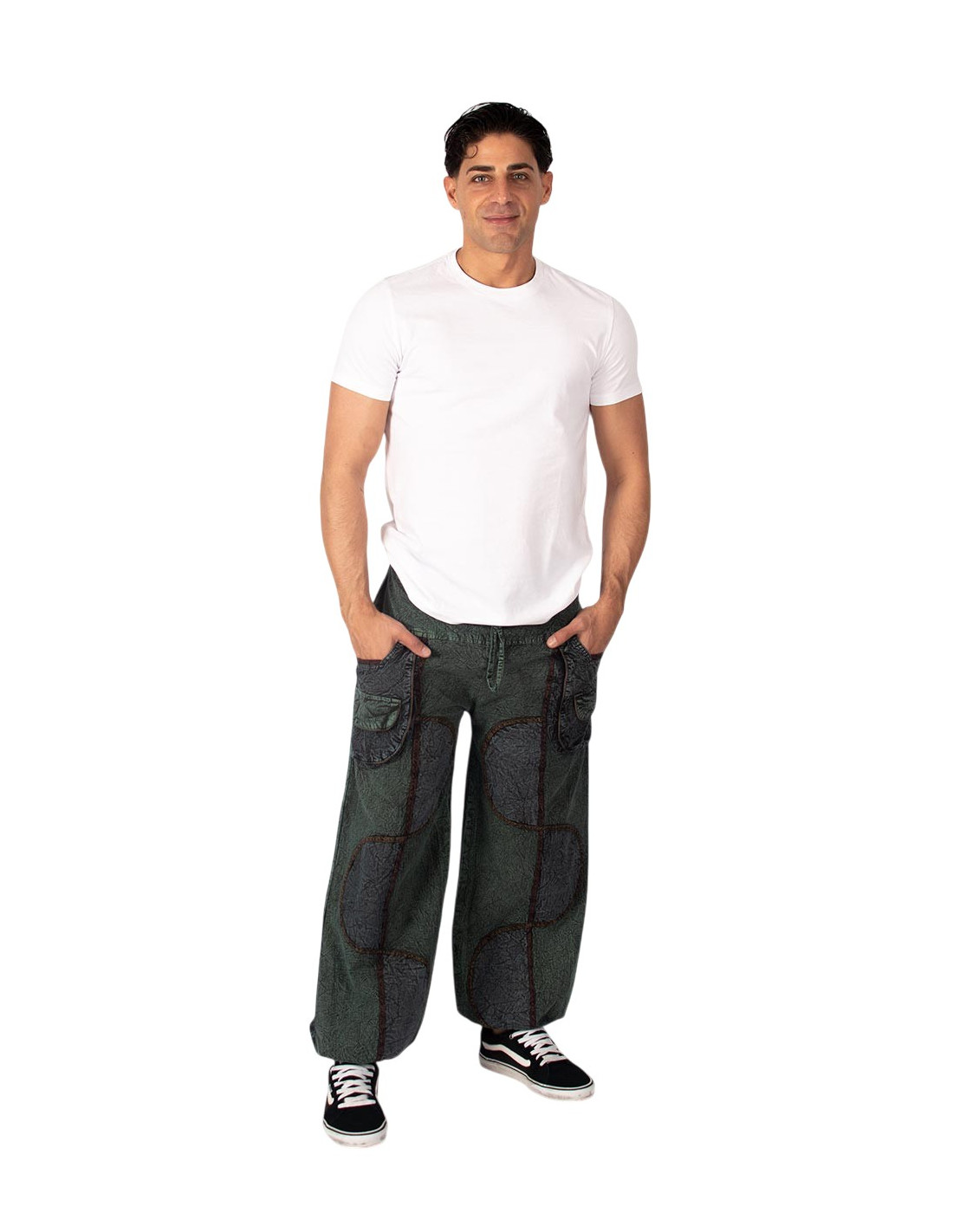 Kimago unisex harem pants in various colors, with pockets, decorative stitching and adjustable waist. Indian handicrafts in one size only.