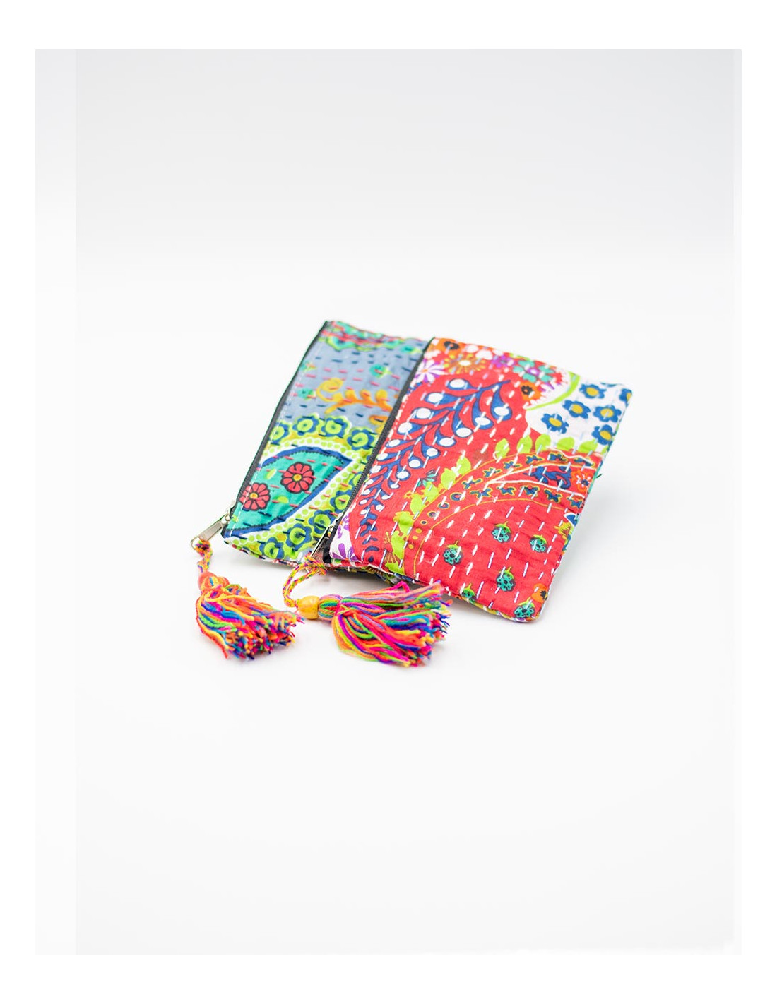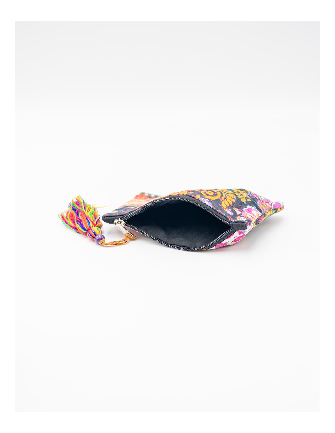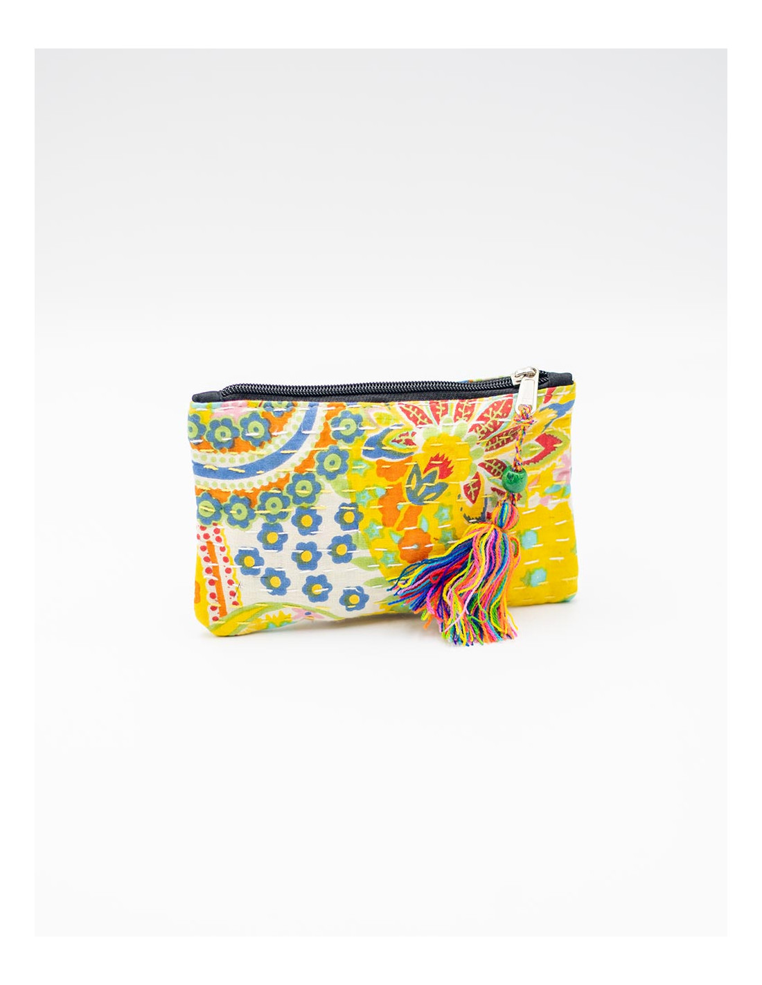 Kimago cushion cover in printed cotton, with embroidered flowers and handcrafted finish inspired by India.