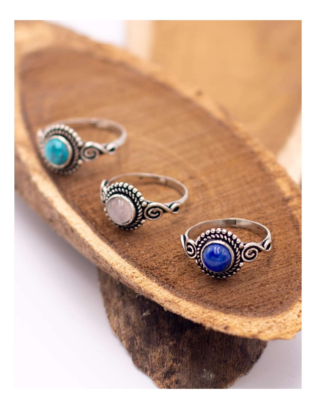 Cada unidad incorpora una piedra de color diferente, lo que convierte cada anillo en una pieza única y especial. Su diseño discreto y de tamaño reducido lo hace muy cómodo de llevar y perfecto para combinar con otros anillos o complementos de estilo boho y espiritual.