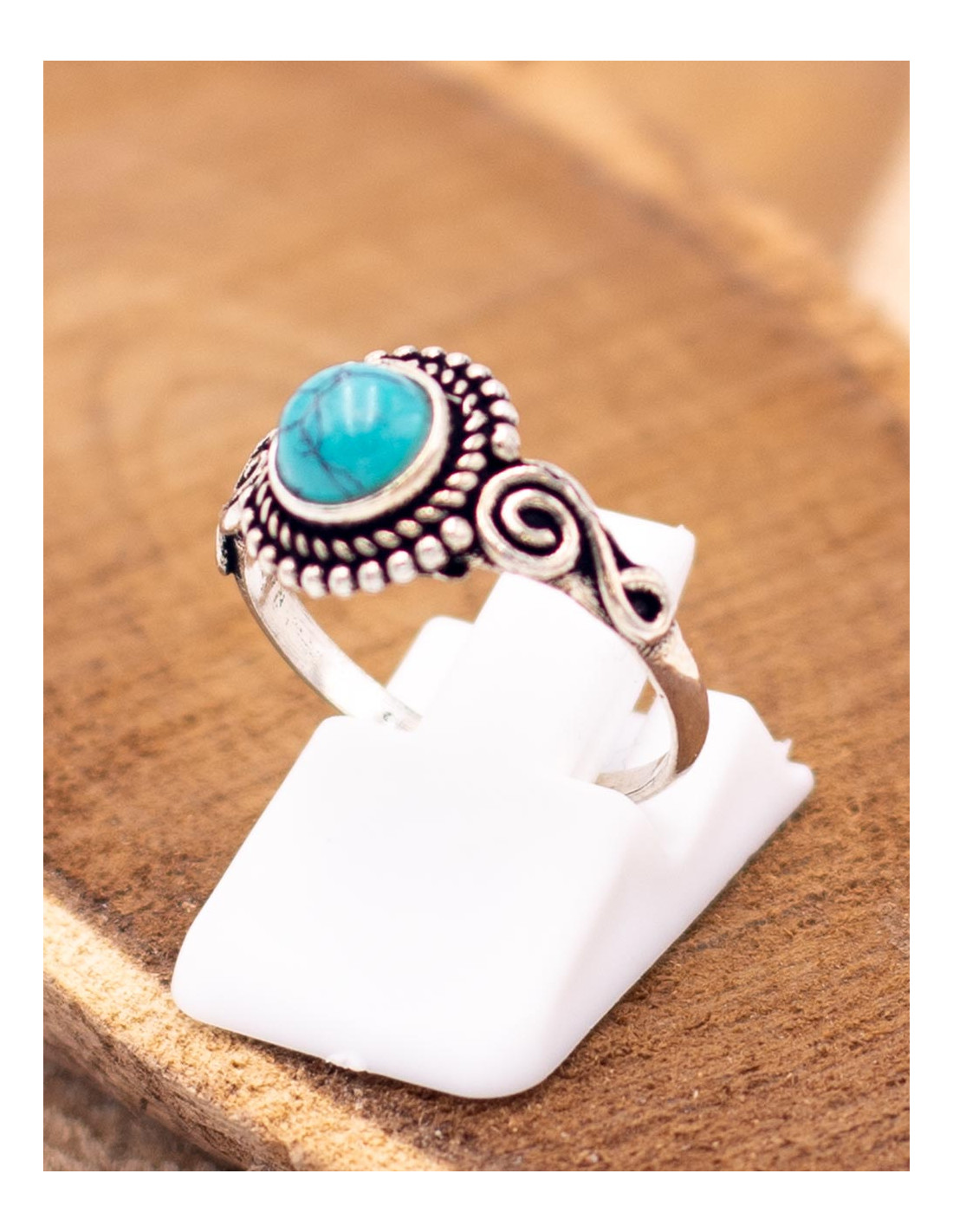 Fabricado en metal plateado, presenta una piedra mineral natural en la parte superior, rodeada de delicados detalles tallados que aportan un toque étnico y distintivo.