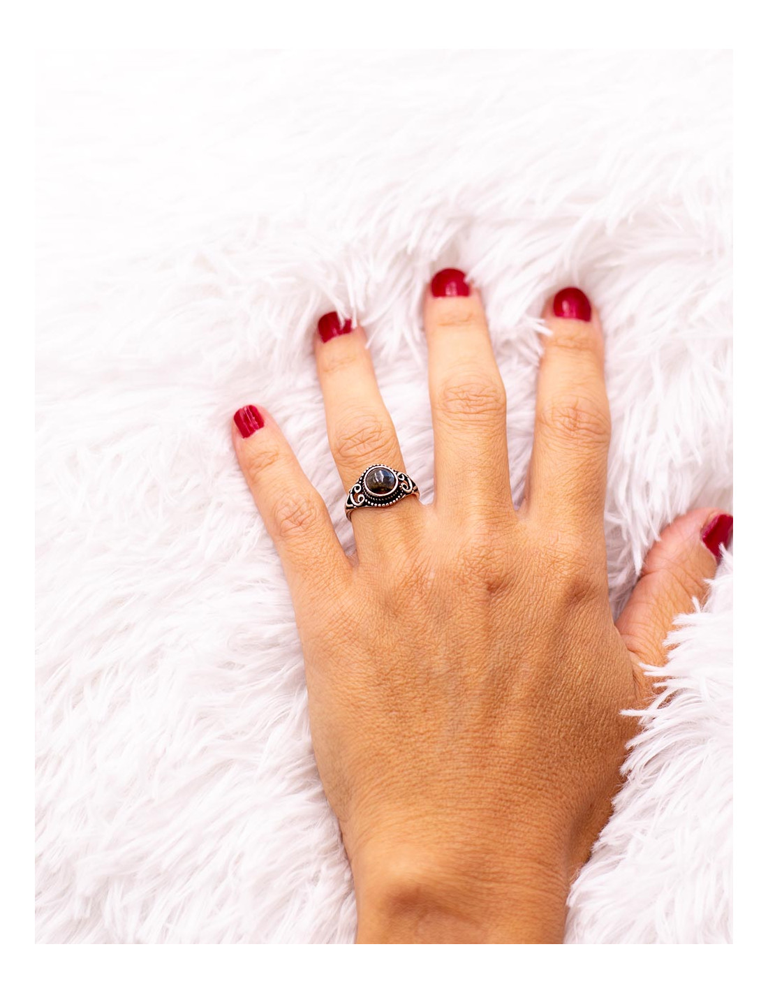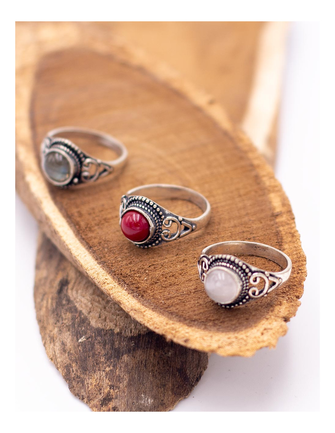 Los colores de las piedras varían en cada unidad, por lo que cada anillo posee una personalidad propia y exclusiva. Su diseño ligero y de tamaño discreto lo convierte en un complemento muy fácil de combinar con otros anillos o pulseras de estilo boho, alternativo o espiritual.